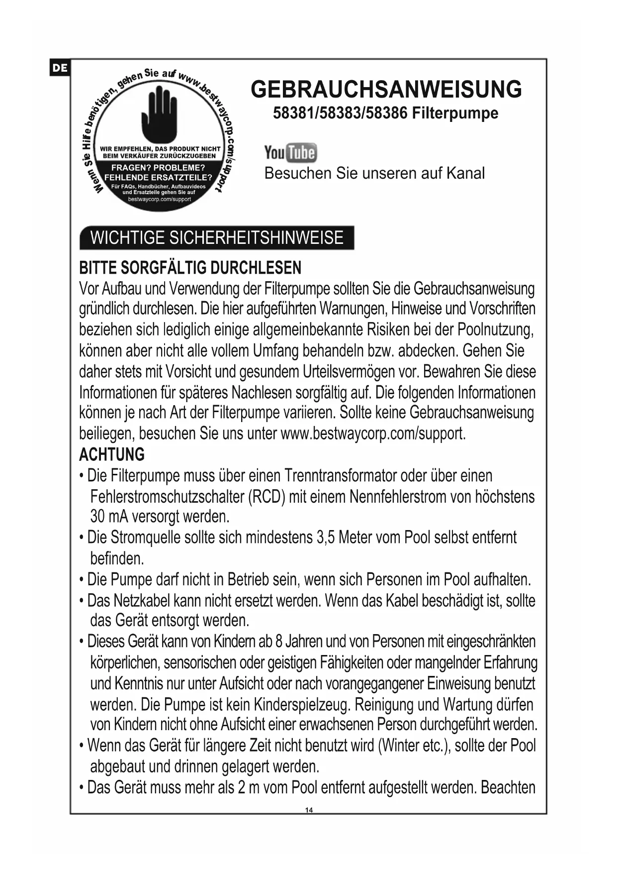 Vor Aufbau und Verwendung der Filterpumpe sollten Sie die Gebrauchsanweisung gründlich durchlesen. Die hier aufgeführten Warnungen, Hinweise und Vorschriften beziehen sich lediglich einige allgemeinbekannte Risiken bei der Poolnutzung, können aber nicht alle vollem Umfang behandeln bzw. abdecken. Gehen Sie daher stets mit Vorsicht und gesundem Urteilsvermögen vor. Bewahren Sie diese Informationen für späteres Nachlesen sorgfältig auf. Die folgenden Informationen können je nach Art der Filterpumpe variieren. Sollte keine Gebrauchsanweisung beiliegen, besuchen Sie uns unter www.bestwaycorp.com/support. ACHTUNG