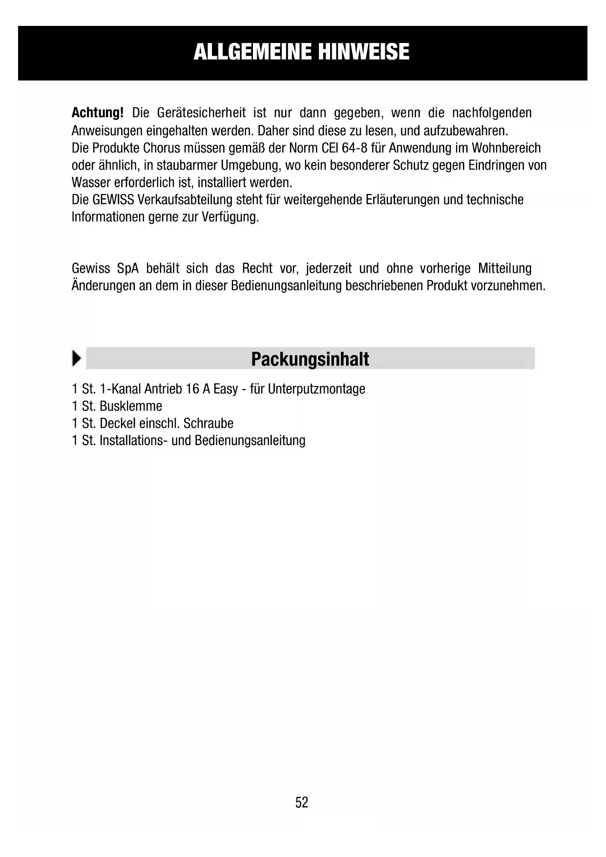 Achtung! Die Gerätesicherheit ist nur dann gegeben, wenn die nachfolgenden Anweisungen eingehalten werden. Daher sind diese zu lesen, und aufzubewahren. Die Produkte Chorus mussen gemäß der Norm CEI 64-8 für Anwendung im Wohnbereich oder ähnlich, in staubarmer Umgebung, wo kein besonderer Schutz gegen Eindringen von Wasser erforderlich ist, installiert werden. Die GEWISS Verkaufsabteilung steht für weitergehende Erläuterungen und technische Informationenigeria zur Verfugung.