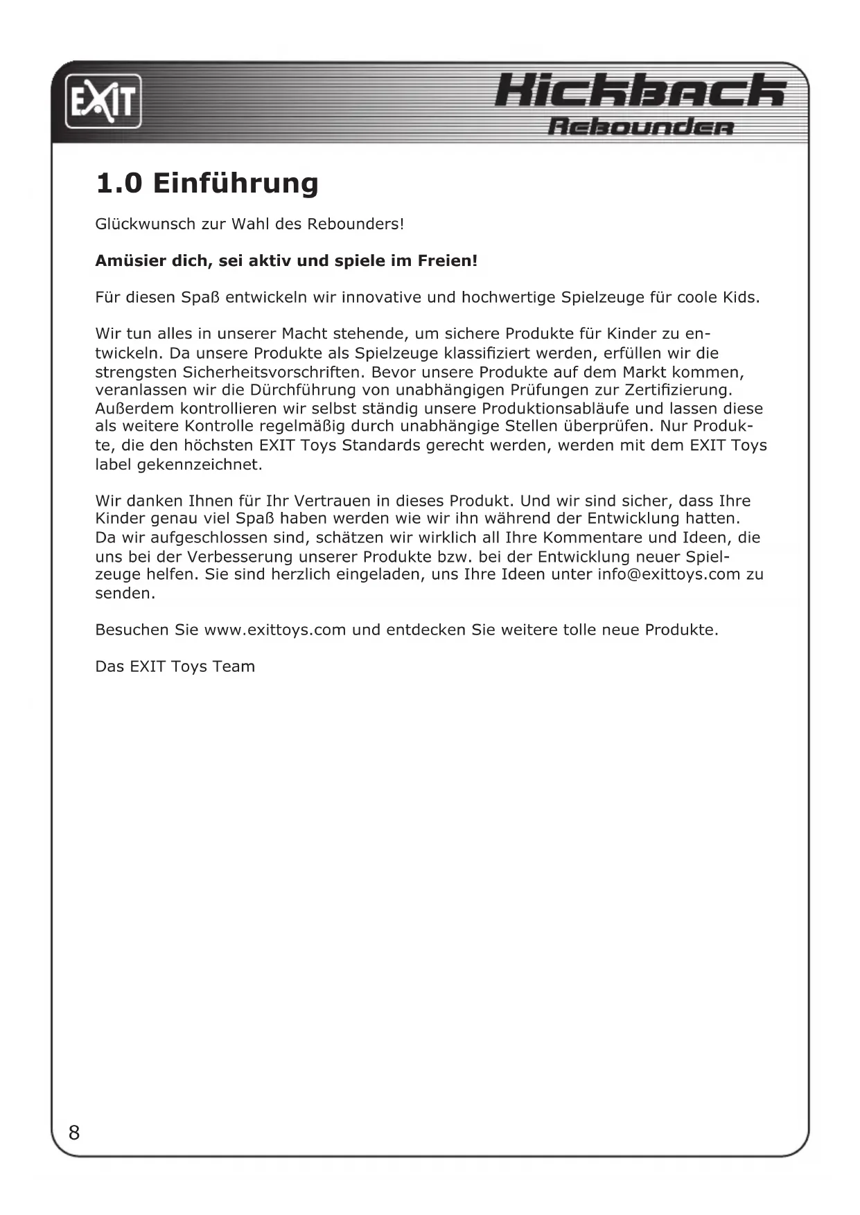 Wir danken Ihnen für Ihr Vertrauen in diesen Produkt. Und wir sind sicher, dass ihre Kinder genau viel Spaß haben werden wie wir ihn während der Entwicklung hatten. Da wir aufgeschlossen sind, schätzen wir wirklich all ihre Kommentare und Ideen, die uns bei der Verbesserung unserer Produkte bzw. bei der Entwicklung neuer Spiel-zeuge halten. Sie sind herzlich eingeladen, uns ihre Ideen unter info@exittoys.com zu senden.