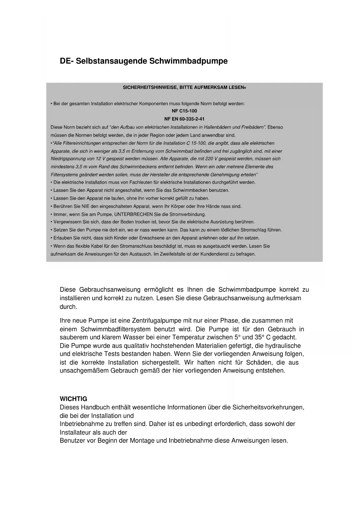 Ohre neue Pumpe ist eine Zentrifugalpumpe mit nur einer Phase, die zusammen mit einem Schwimmbadfiltersystem benutzt wird. Die Pumpe ist für den Gebrauch in sauberem und klarem Wasser bei einer Temperatur zwischen 5^ und 35^ gedacht. Die Pumpe wurde aus qualitativ hochstehenden Materialien gefertigt, die hydraulische und elektrische Tests bestanden haben. Wenn Sie der vorliegenden Anweisung folgen, ist die korrekte Installation sichergestellt. Wir haften nicht für Schäden, die aus unsachgemäßem Gebrauch gemäß der hier vorliegenden Anweisung entstehen.