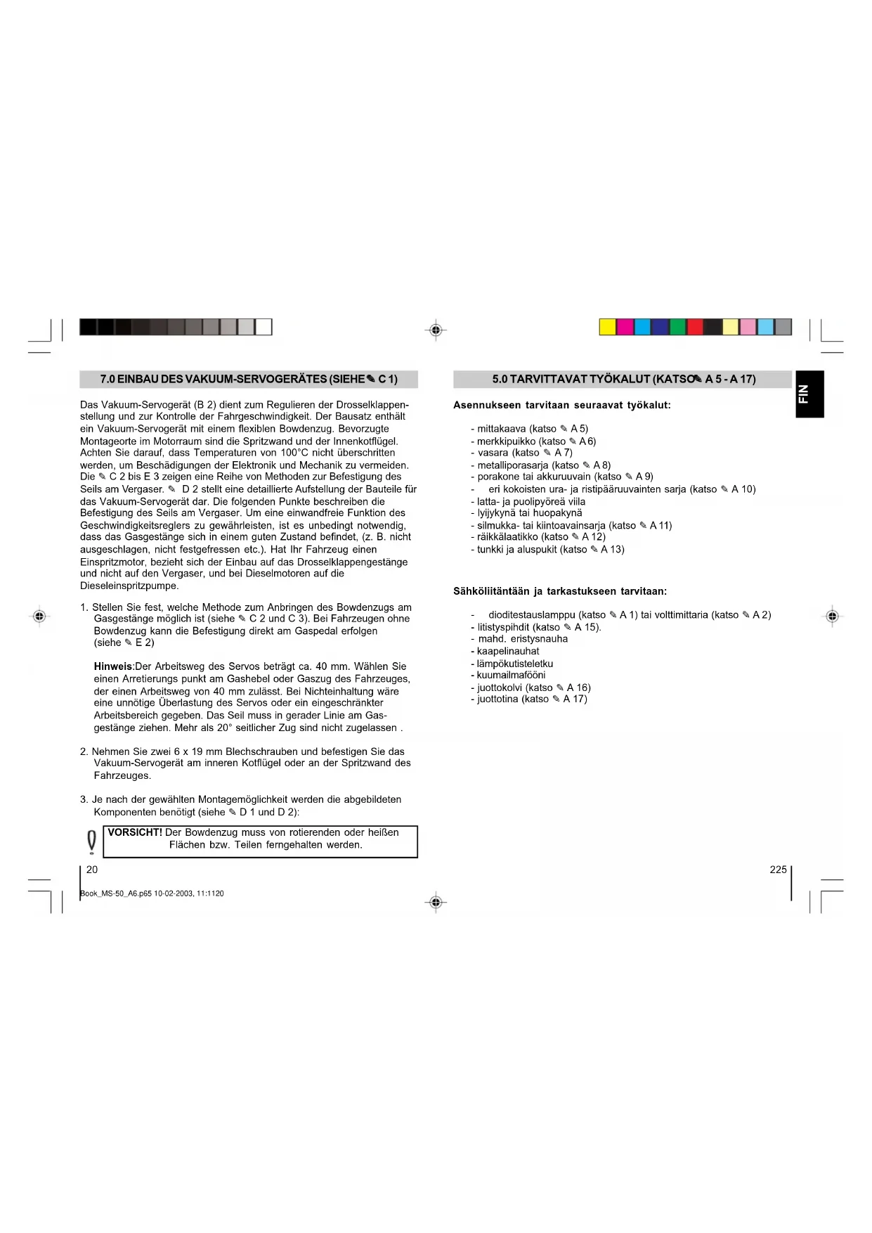 du et egnet hull i nærheten av betjeningsenheten (B 1). Book_MS-50_A6.p65 10-02-2003, 11:113536 Schalten Sie die Zündung aus. Treten Sie kurz auf die Bremse damit der Speicher im Elektronikmodul gelöscht wird. Schalten Sie das Schaltgetriebe bzw. das Automatik- getrieb in den Leerlauf bzw. auf Neutral (Handbremse anziehen). Starten Sie bei gedrückter SET-Taste den Motor. Wenn der Motor läuft, die SET-Taste loslassen. Betätigen Sie 1 mal die ON/OFF-Taste. Die LED im Bedienteil leuchtet auf. MAGIC- SPEED befindet sich jetzt im Diagnosemodus. Halten Sie die SET-Taste ge- drückt. Die Motordrehzahl muss langsam ansteigen (Achtung las- sen Sie nicht den Motor nicht überdrehen). Sobald die SET-Ta- ste losgelassen wird muss die bis dahin erreichte Motordrehzahl gehalten werden.