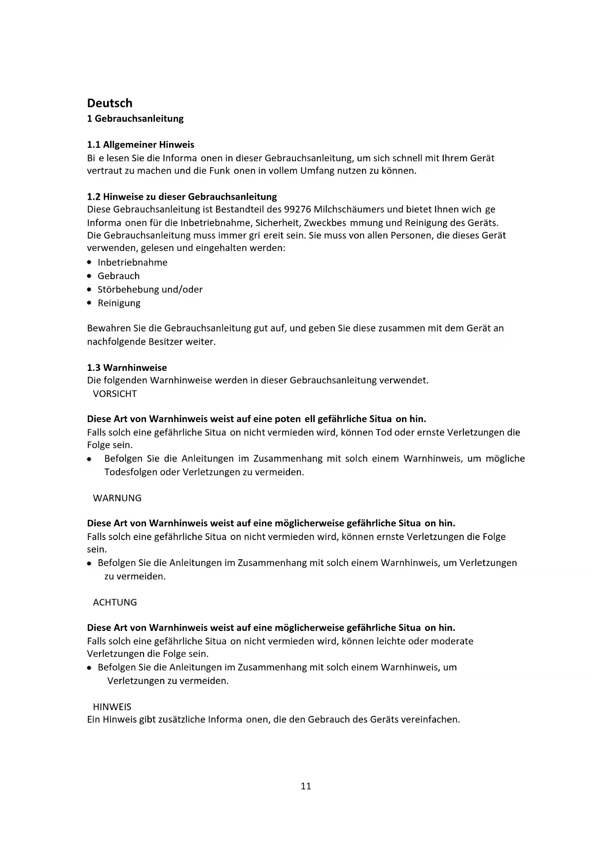 HINWEIS Bitte befolgen Sie die nachfolgenden allgemeinen Sicherheitsinformationen für den sicheren Gebrauch des Geräts. Überprüfen Sie das Gerät vor dem Gebrauch auf mögliche Schäden. Verwenden Sie niemals ein beschädigtes Gerät. Falls das Netzkabel beschädigt ist, muss dieses von einem autorisierten Elektriker durch ein spezielles Netzkabel ersetzt werden. Das Gerät ist nicht geeignet für den Gebrauch durch Kinder oder Personen mit eingeschränkten körperlichen, sensorischen oder geistigen Fähigkeiten, oder ohne Erfahrung und Wissen, es sei denn sie werden von einer für ihre Sicherheit zuständigen Person beaufsichtigt oder bzgl. des Gebrauchs des Geräts angeleitet. Kinder müssen beaufsichtigt werden, damit sie nicht mit dem Gerät spielen. Dieses Gerät ist geeignet für den Gebrauch durch Kinder ab 8 Jahren und Personen mit eingeschränkten körperlichen, sensorischen oder geistigen Fähigkeiten, oder ohne Erfahrung und Wissen, sofern sie beaufsichtigt oder bzgl. des sicheren Gebrauchs des Geräts angeleitet werden und die damit einhergehenden Gefahren verstehen. Reinigungs- und Wartungsarbeiten dürfen nur von Kindern durchgeführt werden, die älter als 8 Jahre sind und beaufsichtigt werden. Gerät und dessen Netzkabel von Kindern unter 8 Jahren fernhalten. Lassen Sie das Gerät während des Betriebs nicht unbeaufsichtigt. Erforderliche Reparaturen dürfen nur von qualifizierten Elektrikern durchgeführt werden, die vom Hersteller ausgebildet wurden. Unsachgemäße Reparaturen können für den Benutzer erhebliche Gefahren darstellen. Innerhalb der Garantiezeit dürfen Reparaturen nur von Kundendiensten durchgeführt werden,13 die vom Hersteller autorisiert wurden, da anderenfalls die Garantie nichtig wird und mögliche Folgeschäden nicht mehr gedeckt sind. Fehlerhafte Bauteile dürfen nur durch Originalersatzteile ersetzt werden. Nur solche Ersatzteile erfüllen die notwendigen Sicherheitsanforderungen. Verwenden Sie keine anderen Flüssigkeiten als Milch.