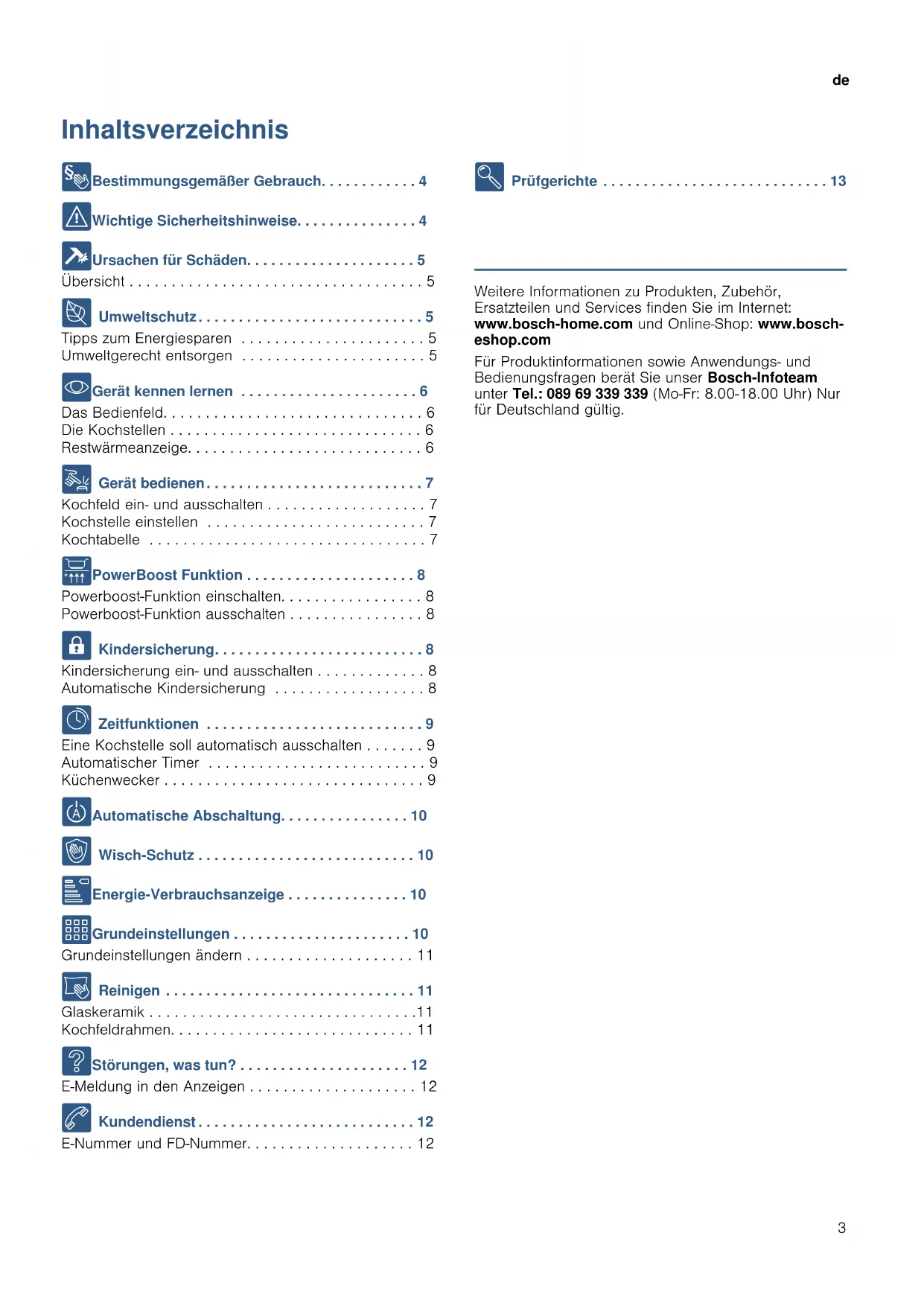 - Gerät kennen lernen . . . . . . . . . . . . . . . . . . . . . . 6 Das Bedienfeld. . . . . . . . . . . . . . . . . . . . . . . . . . . . . . . 6 Die Kochstellen . . . . . . . . . . . . . . . . . . . . . . . . . . . . . . 6 Restwärmeanzeige. . . . . . . . . . . . . . . . . . . . . . . . . . . . 6 1 Gerät bedienen. . . . . . . . . . . . . . . . . . . . . . . . . . . 7 Kochfeld ein- und ausschalten . . . . . . . . . . . . . . . . . . . 7 Kochstelle einstellen . . . . . . . . . . . . . . . . . . . . . . . . . . 7 Kochtabelle . . . . . . . . . . . . . . . . . . . . . . . . . . . . . . . . . 7 v PowerBoost Funktion . . . . . . . . . . . . . . . . . . . . . 8 Powerboost-Funktion einschalten. . . . . . . . . . . . . . . . . 8 Powerboost-Funktion ausschalten . . . . . . . . . . . . . . . . 8 A Kindersicherung. . . . . . . . . . . . . . . . . . . . . . . . . . 8 Kindersicherung ein- und ausschalten . . . . . . . . . . . . . 8 Automatische Kindersicherung . . . . . . . . . . . . . . . . . . 8 O Zeitfunktionen . . . . . . . . . . . . . . . . . . . . . . . . . . . 9 Eine Kochstelle soll automatisch ausschalten . . . . . . . 9 Automatischer Timer . . . . . . . . . . . . . . . . . . . . . . . . . . 9 Küchenwecker . . . . . . . . . . . . . . . . . . . . . . . . . . . . . . . 9 b Automatische Abschaltung. . . . . . . . . . . . . . . . 10 k Wisch-Schutz . . . . . . . . . . . . . . . . . . . . . . . . . . . 10 [ Energie-Verbrauchsanzeige . . . . . . . . . . . . . . . 10 Q Grundeinstellungen . . . . . . . . . . . . . . . . . . . . . . 10 Grundeinstellungen ändern . . . . . . . . . . . . . . . . . . . . 11 D Reinigen . . . . . . . . . . . . . . . . . . . . . . . . . . . . . . . 11 Glaskeramik . . . . . . . . . . . . . . . . . . . . . . . . . . . . . . . .11 Kochfeldrahmen. . . . . . . . . . . . . . . . . . . . . . . . . . . . . 11 3 Störungen, was tun? . . . . . . . . . . . . . . . . . . . . . 12 E-Meldung in den Anzeigen . . . . . . . . . . . . . . . . . . . . 12 4 Kundendienst . . . . . . . . . . . . . . . . . . . . . . . . . . . 12 E-Nummer und FD-Nummer. . . . . . . . . . . . . . . . . . . . 12 E Prüfgerichte . . . . . . . . . . . . . . . . . . . . . . . . . . . . 13 Produktinfo Weitere Informationen zu Produkten, Zubehör, Ersatzteilen und Services finden Sie im Internet: www.bosch-home.com und Online-Shop: www.bosch- eshop.com Für Produktinformationen sowie Anwendungs- und Bedienungsfragen berät Sie unser Bosch-Infoteam unter Tel.: 089 69 339 339 (Mo-Fr: 8.00-18.00 Uhr) Nur für Deutschland gültig.de Bestimmungsgemäßer Gebrauch