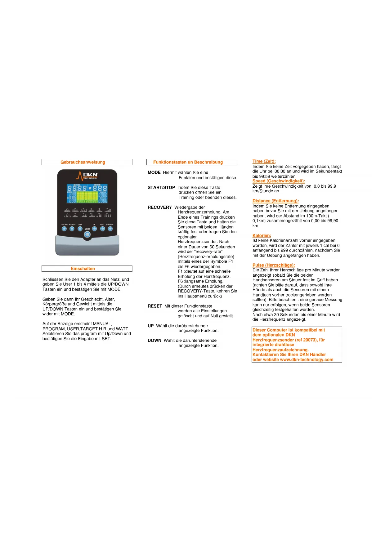 Deiher Computer ist kompatibel mit dem optionalen DKN Herzfrequenzender (ref 20073), fur integrierte drahtlose Herzfrequenzaufzeichnung. Kontaktieren Sie ihren DKN Handler oder website www.dkn-technology.de