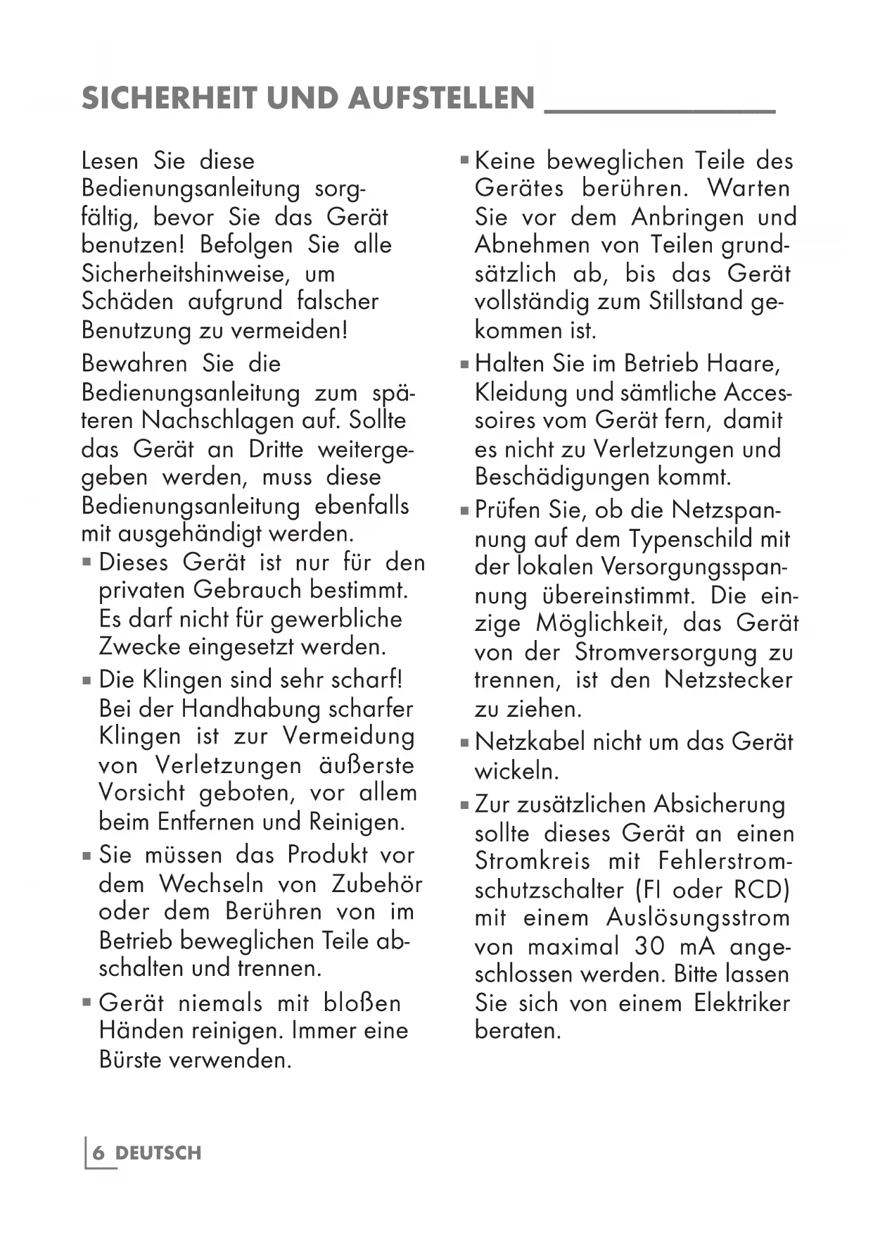 Zur zusätzlichen Absicherung sollte dieses Gerät an einen Stromkreis mit Fehlerstrom- schutzschalter (FI oder RCD) mit einem Auslösungsstrom von maximal 30 mA ange- schlossen werden. Bitte lassen Sie sich von einem Elektriker beraten.DEUTSCH 7