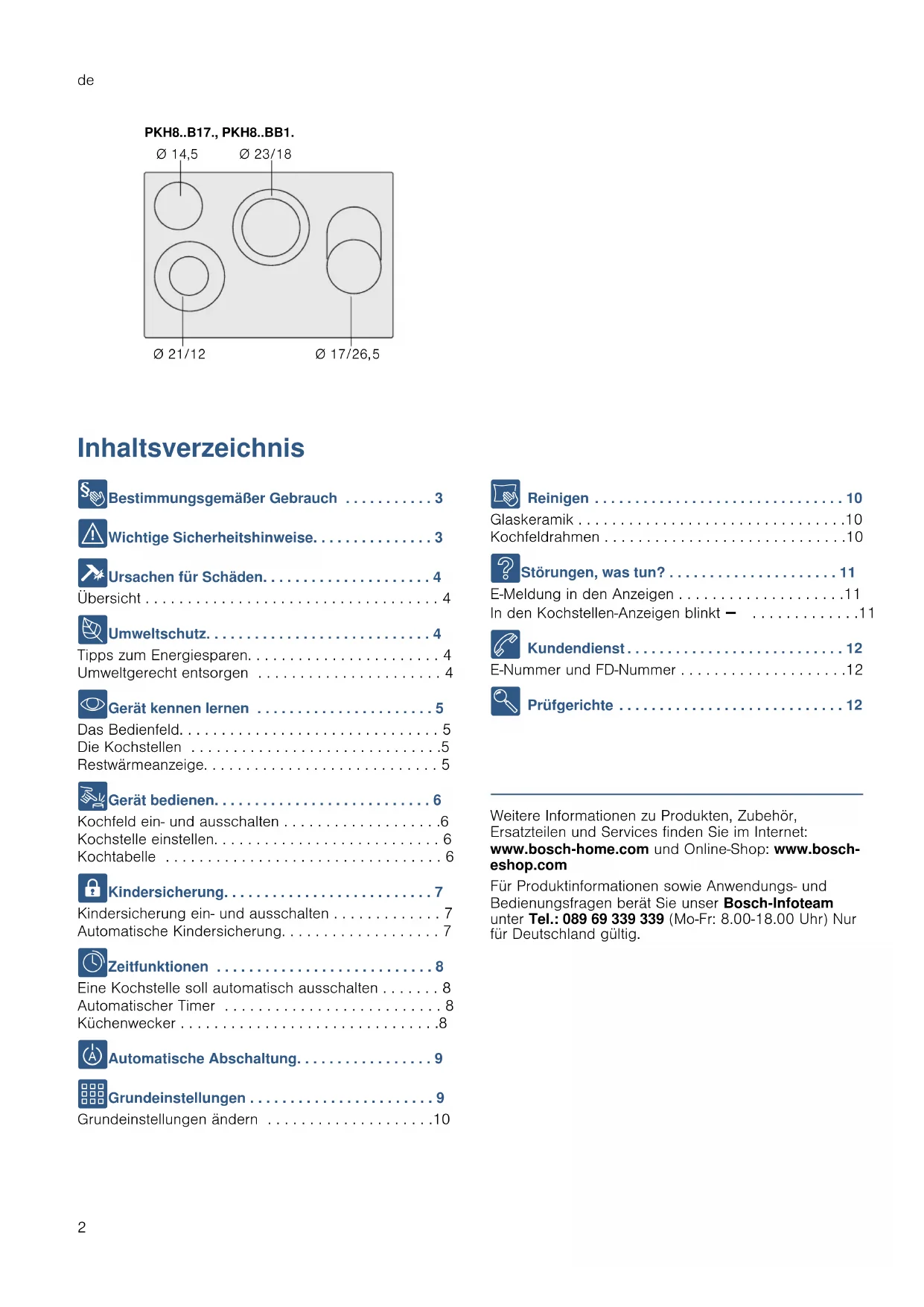 - Gerät kennen lernen . . . . . . . . . . . . . . . . . . . . . . 5 Das Bedienfeld. . . . . . . . . . . . . . . . . . . . . . . . . . . . . . . 5 Die Kochstellen . . . . . . . . . . . . . . . . . . . . . . . . . . . . . .5 Restwärmeanzeige. . . . . . . . . . . . . . . . . . . . . . . . . . . . 5 1 Gerät bedienen. . . . . . . . . . . . . . . . . . . . . . . . . . . 6 Kochfeld ein- und ausschalten . . . . . . . . . . . . . . . . . . .6 Kochstelle einstellen. . . . . . . . . . . . . . . . . . . . . . . . . . . 6 Kochtabelle . . . . . . . . . . . . . . . . . . . . . . . . . . . . . . . . . 6 A Kindersicherung. . . . . . . . . . . . . . . . . . . . . . . . . . 7 Kindersicherung ein- und ausschalten . . . . . . . . . . . . . 7 Automatische Kindersicherung. . . . . . . . . . . . . . . . . . . 7 O Zeitfunktionen . . . . . . . . . . . . . . . . . . . . . . . . . . . 8 Eine Kochstelle soll automatisch ausschalten . . . . . . . 8 Automatischer Timer . . . . . . . . . . . . . . . . . . . . . . . . . . 8 Küchenwecker . . . . . . . . . . . . . . . . . . . . . . . . . . . . . . .8 b Automatische Abschaltung. . . . . . . . . . . . . . . . . 9 Q Grundeinstellungen . . . . . . . . . . . . . . . . . . . . . . . 9 Grundeinstellungen ändern . . . . . . . . . . . . . . . . . . . .10 D Reinigen . . . . . . . . . . . . . . . . . . . . . . . . . . . . . . . 10 Glaskeramik . . . . . . . . . . . . . . . . . . . . . . . . . . . . . . . .10 Kochfeldrahmen . . . . . . . . . . . . . . . . . . . . . . . . . . . . .10 3 Störungen, was tun? . . . . . . . . . . . . . . . . . . . . . 11 E-Meldung in den Anzeigen . . . . . . . . . . . . . . . . . . . .11 In den Kochstellen-Anzeigen blinkt A . . . . . . . . . . . . .11 4 Kundendienst . . . . . . . . . . . . . . . . . . . . . . . . . . . 12 E-Nummer und FD-Nummer . . . . . . . . . . . . . . . . . . . .12 E Prüfgerichte . . . . . . . . . . . . . . . . . . . . . . . . . . . . 12 Produktinfo Weitere Informationen zu Produkten, Zubehör, Ersatzteilen und Services finden Sie im Internet: www.bosch-home.com und Online-Shop: www.bosch- eshop.com Für Produktinformationen sowie Anwendungs- und Bedienungsfragen berät Sie unser Bosch-Infoteam unter Tel.: 089 69 339 339 (Mo-Fr: 8.00-18.00 Uhr) Nur für Deutschland gültig. 3.+%3.+%%