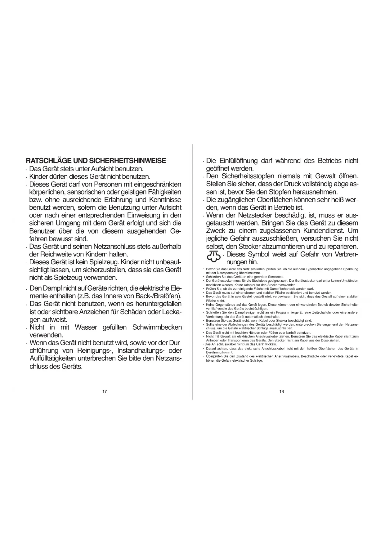 17. Dieses Produkt ist für den Hausgebrauch und nicht für gewerbliche Zwecke bestimmt.