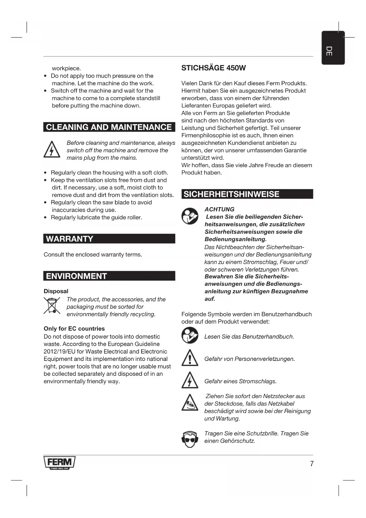 Vielen Dank für den Kauf dieses Ferm Produkts. Hiermit haben Sie ein ausgezeichnetes Produkt erworben, dass von einem der führenden Lieferanten Europas geliefert wird. Alle von Ferm an Sie gelieferten Produkte sind nach den höchsten Standards von Leistung und Sicherheit gefertigt. Teil unserer Firmenphilosophie ist es auch, Ihnen einen ausgezeichneten Kundendienst anbieten zu können, der von unserer umfassenden Garantie unterstützt wird. Wir hoffen, dass Sie viele Jahre Freude an diesem Produkt haben. SICHERHEITSHINWEISE ACHTUNG Lesen Sie die beiliegenden Sicher- heitsanweisungen, die zusätzlichen Sicherheitsanweisungen sowie die Bedienungsanleitung. Das Nichtbeachten der Sicherheitsan- weisungen und der Bedienungsanleitung kann zu einem Stromschlag, Feuer und/ oder schweren Verletzungen führen. Bewahren Sie die Sicherheits- anweisungen und die Bedienungs- anleitung zur künftigen Bezugnahme auf. Folgende Symbole werden im Benutzerhandbuch oder auf dem Produkt verwendet: Lesen Sie das Benutzerhandbuch. Gefahr von Personenverletzungen. Gefahr eines Stromschlags. Ziehen Sie sofort den Netzstecker aus der Steckdose, falls das Netzkabel beschädigt wird sowie bei der Reinigung und Wartung. Tragen Sie eine Schutzbrille. Tragen Sie einen Gehörschutz.8