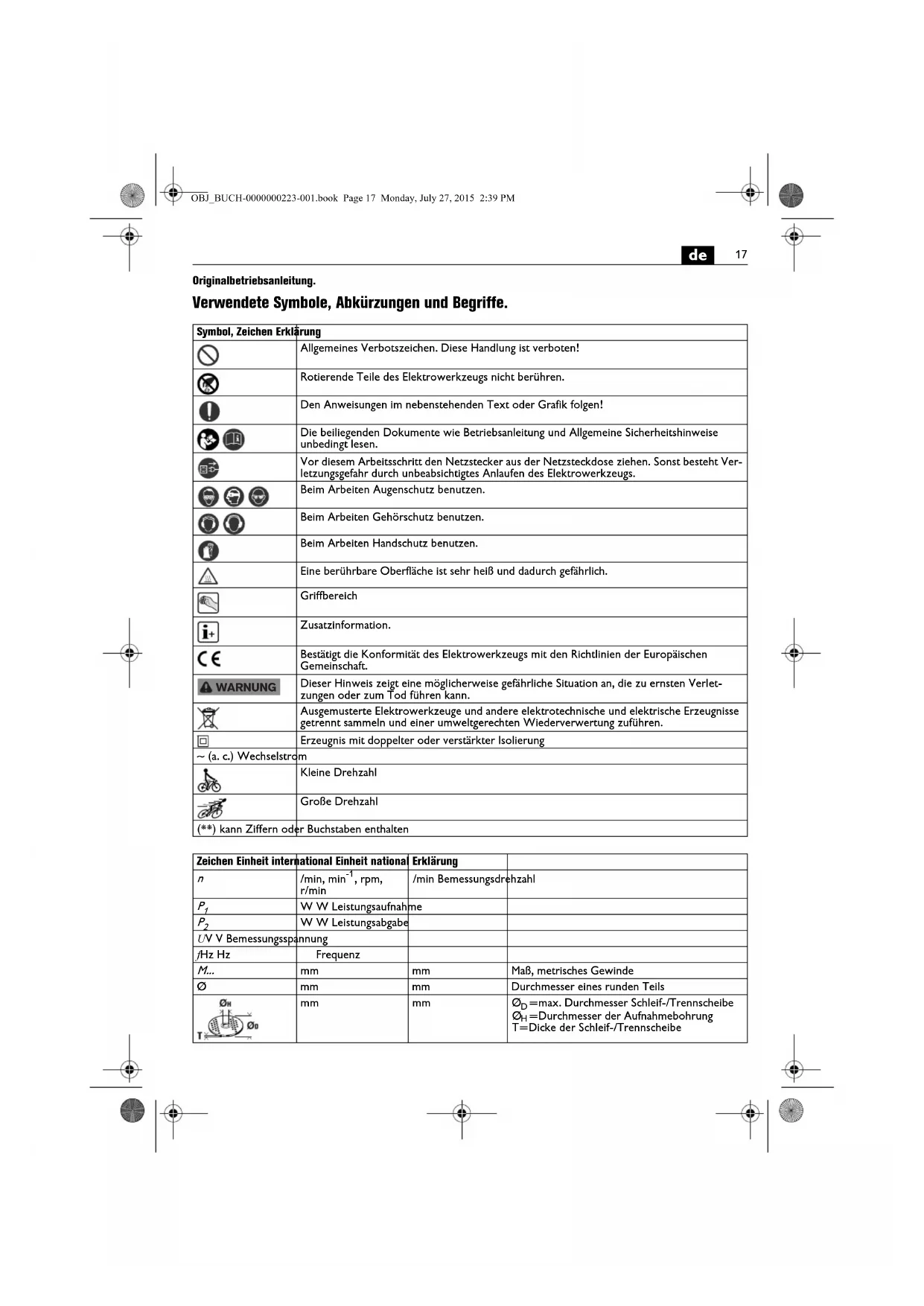 Originalbetriebsanleitung. Verwendete Symbole, Abkürzungen und Begriffe. Symbol, Zeichen Erklärung Allgemeines Verbotszeichen. Diese Handlung ist verboten! Rotierende Teile des Elektrowerkzeugs nicht berühren. Den Anweisungen im nebenstehenden Text oder Grafik folgen! Die beiliegenden Dokumente wie Betriebsanleitung und Allgemeine Sicherheitshinweise unbedingt lesen. Vor diesem Arbeitsschritt den Netzstecker aus der Netzsteckdose ziehen. Sonst besteht Ver- letzungsgefahr durch unbeabsichtigtes Anlaufen des Elektrowerkzeugs. Beim Arbeiten Augenschutz benutzen. Beim Arbeiten Gehörschutz benutzen. Beim Arbeiten Handschutz benutzen. Eine berührbare Oberfläche ist sehr heiß und dadurch gefährlich. Griffbereich Zusatzinformation. Bestätigt die Konformität des Elektrowerkzeugs mit den Richtlinien der Europäischen Gemeinschaft. Dieser Hinweis zeigt eine möglicherweise gefährliche Situation an, die zu ernsten Verlet- zungen oder zum Tod führen kann. Ausgemusterte Elektrowerkzeuge und andere elektrotechnische und elektrische Erzeugnisse getrennt sammeln und einer umweltgerechten Wiederverwertung zuführen. Erzeugnis mit doppelter oder verstärkter Isolierung ~ (a. c.) Wechselstrom Kleine Drehzahl Große Drehzahl (**) kann Ziffern oder Buchstaben enthalten WARNUNG Zeichen Einheit international Einheit national Erklärung