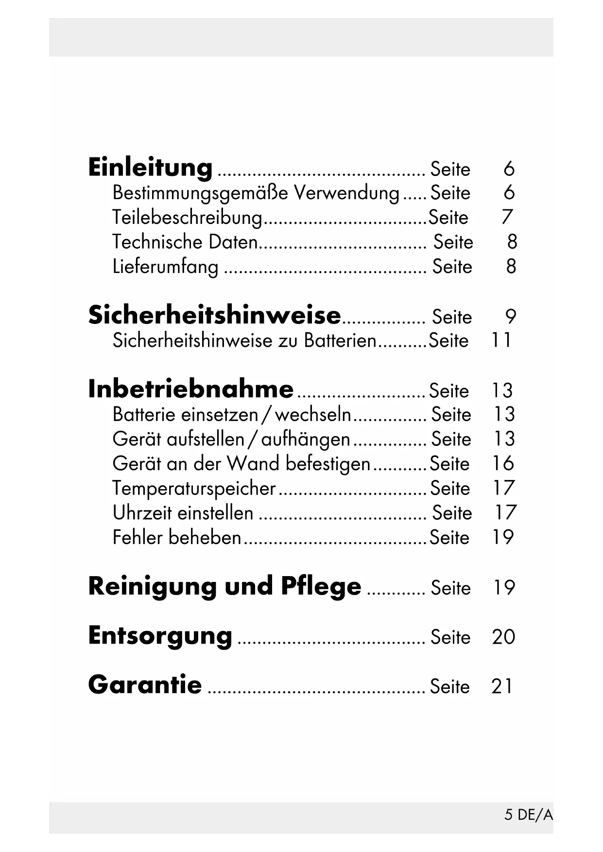 115 DE/AT/CH Einleitung .......................................... Seite 6 Bestimmungsgemäße Verwendung ..... Seite 6 Teilebeschreibung ................................. Seite 7 Technische Daten.................................. Seite 8 Lieferumfang ......................................... Seite 8 Sicherheitshinweise................. Seite 9 Sicherheitshinweise zu Batterien .......... Seite 11 Inbetriebnahme .......................... Seite 13 Batterie einsetzen / wechseln ............... Seite 13 Gerät aufstellen / aufhängen ............... Seite 13 Gerät an der Wand befestigen ........... Seite 16 Temperaturspeicher .............................. Seite 17 Uhrzeit einstellen .................................. Seite 17 Fehler beheben ..................................... Seite 19 Reinigung und Pflege ............ Seite 19 Entsorgung ...................................... Seite 20 Garantie ............................................ Seite 216 DE/AT/CH Innen- / Außenthermometer