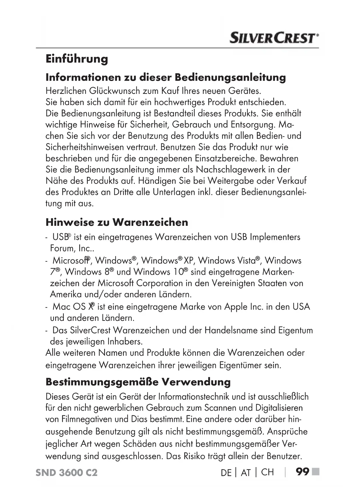 ist eine eingetragene Marke von Apple Inc. in den USA und anderen Ländern. - Das SilverCrest Warenzeichen und der Handelsname sind Eigentum des jeweiligen Inhabers. Alle weiteren Namen und Produkte können die Warenzeichen oder eingetragene Warenzeichen ihrer jeweiligen Eigentümer sein. Bestimmungsgemäße Verwendung Dieses Gerät ist ein Gerät der Informationstechnik und ist ausschließlich für den nicht gewerblichen Gebrauch zum Scannen und Digitalisieren von Filmnegativen und Dias bestimmt. Eine andere oder darüber hin- ausgehende Benutzung gilt als nicht bestimmungsgemäß. Ansprüche jeglicher Art wegen Schäden aus nicht bestimmungsgemäßer Ver- wendung sind ausgeschlossen. Das Risiko trägt allein der Benutzer.SND 3600 C2 ■ 100