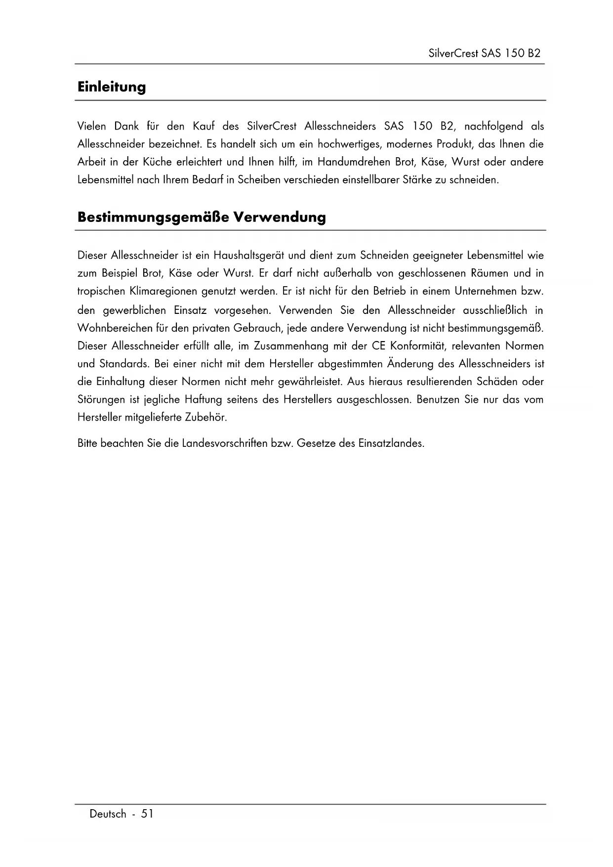 - Garantiehinweise SilverCrest SAS 150 B2 Deutsch - 51 Einleitung Vielen Dank für den Kauf des SilverCrest Allesschneiders SAS 150 B2, nachfolgend als Allesschneider bezeichnet. Es handelt sich um ein hochwertiges, modernes Produkt, das Ihnen die Arbeit in der Küche erleichtert und Ihnen hilft, im Handumdrehen Brot, Käse, Wurst oder andere Lebensmittel nach Ihrem Bedarf in Scheiben verschieden einstellbarer Stärke zu schneiden. Bestimmungsgemäße Verwendung Dieser Allesschneider ist ein Haushaltsgerät und dient zum Schneiden geeigneter Lebensmittel wie zum Beispiel Brot, Käse oder Wurst. Er darf nicht außerhalb von geschlossenen Räumen und in tropischen Klimaregionen genutzt werden. Er ist nicht für den Betrieb in einem Unternehmen bzw. den gewerblichen Einsatz vorgesehen. Verwenden Sie den Allesschneider ausschließlich in Wohnbereichen für den privaten Gebrauch, jede andere Verwendung ist nicht bestimmungsgemäß. Dieser Allesschneider erfüllt alle, im Zusammenhang mit der CE Konformität, relevanten Normen und Standards. Bei einer nicht mit dem Hersteller abgestimmten Änderung des Allesschneiders ist die Einhaltung dieser Normen nicht mehr gewährleistet. Aus hieraus resultierenden Schäden oder Störungen ist jegliche Haftung seitens des Herstellers ausgeschlossen. Benutzen Sie nur das vom Hersteller mitgelieferte Zubehör. Bitte beachten Sie die Landesvorschriften bzw. Gesetze des Einsatzlandes.SilverCrest SAS 150 B2 p. 64