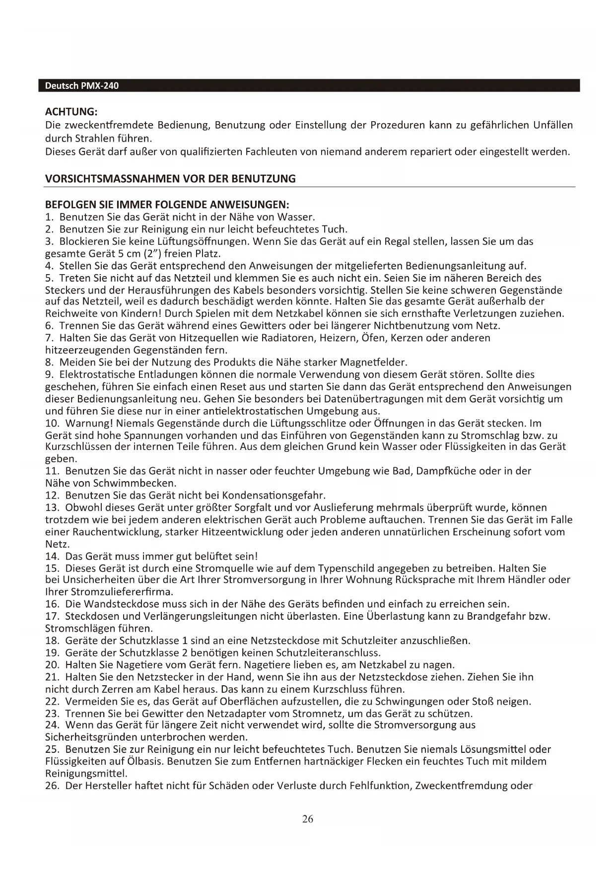 26. Der Hersteller haet nicht für Schäden oder Verluste durch Fehlfunkon, Zweckenremdung oder27