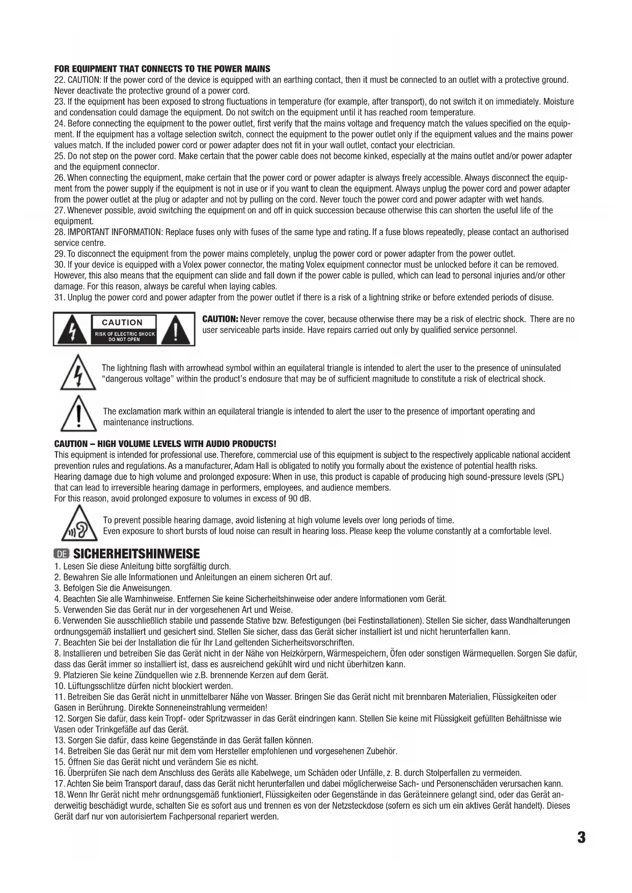 ACHTUNG Entfernen Sie niemals die Abdeckung, da sonst das Risiko eines elektrischen Schlages besteht. Im Inneren des Geräts befinden sich keine Teile, die vom Bediener repariert oder gewartet werden können. Lassen Sie Reparaturen ausschließlich von qualifiziertem Servicepersonal durchführen. Das gleichschenkelige Dreieck mit Blitzsymbol warnt vor nichtisolierten, gefährlichen Spannungen im Geräteinneren, die einen elektrischen Schlag verursachen können. Das gleichschenkelige Dreieck mit Ausrufungszeichen kennzeichnet wichtige Bedienungs- und Wartungshinweise. ACHTUNG HOHE LAUTSTÄRKEN BEI AUDIOPRODUKTEN! Dieses Gerät ist für den professionellen Einsatz vorgesehen. Der kommerzielle Betrieb dieses Geräts unterliegt den jeweils gültigen nationalen Vorschriften und Richtlinien zur Unfallverhütung. Als Hersteller ist Adam Hall gesetzlich verpflichtet, Sie ausdrücklich auf mögliche Gesundheitsrisiken hinzuweisen. Gehörschäden durch hohe Lautstärken und Dauerbelastung: Bei der Verwendung dieses Produkts können hohe Schalldruckpegel (SPL) erzeugt werden, die bei Künstlern, Mitarbeitern und Zuschauern zu irreparablen Gehörschäden führen können. Um eine mögliche Schädigung des Hörsinns zu verhindern, vermeiden Sie das Hören bei großem Lautsärkepegel über lange Zeiträume. Lauter Schalleinfluss kann selbst bei kurzer Dauer zu Hörschäden führen. Bitte halten Sie die Laustärke immer auf einem angenehmen Level.
