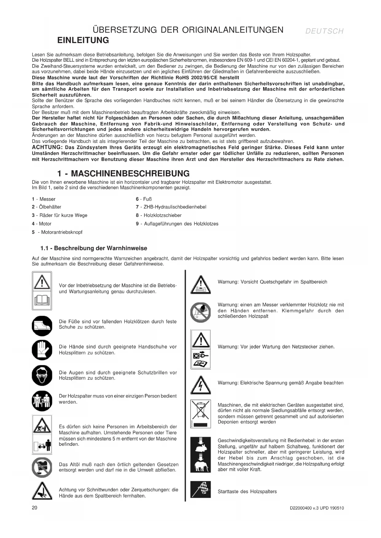 Auf der Maschine sind normgerechte Warnzeichen angebracht, damit der Holzspalter vorsichtig und gefahrlos bedient werden kann.itte lessen Sie aufmerksam die Beschreibung dieser Gefahrenhinweise.