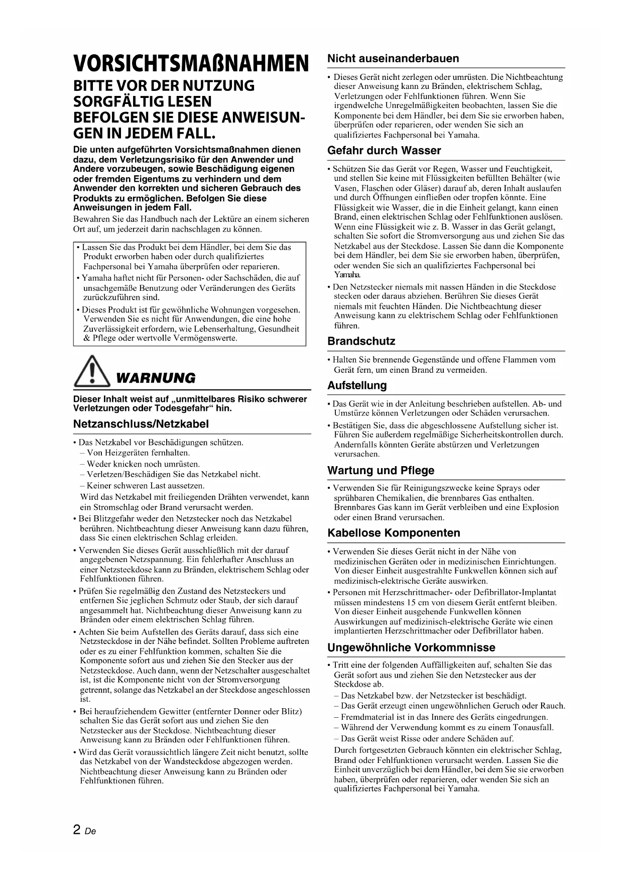 - Achten Sie darauf, diese Einheit nicht fallen zu lassen oder starken Stößen auszusetzen. Wenn die Einheit durch Herunterfallen oder einen starken Stoß beschädigt worden sein könnte, schalten Sie sie sofort aus und ziehen Sie den Stecker oder das Netzteil aus der Steckdose. Die Nichtbeachtung dieser Anweisung kann zu elektrischem Schlag, Bränden, Verletzungen oder Fehlfunktionen führen. Lassen Sie die Einheit unverzüglich bei dem Händler, bei dem Sie sie erworben haben, überprüfen, oder wenden Sie sich an qualifiziertes Fachpersonal bei Yamaha. VORSICHT Der zugehörige Inhalt weist auf „ein Risiko schwerer Verletzungen“ hin. Netzanschluss/Netzkabel