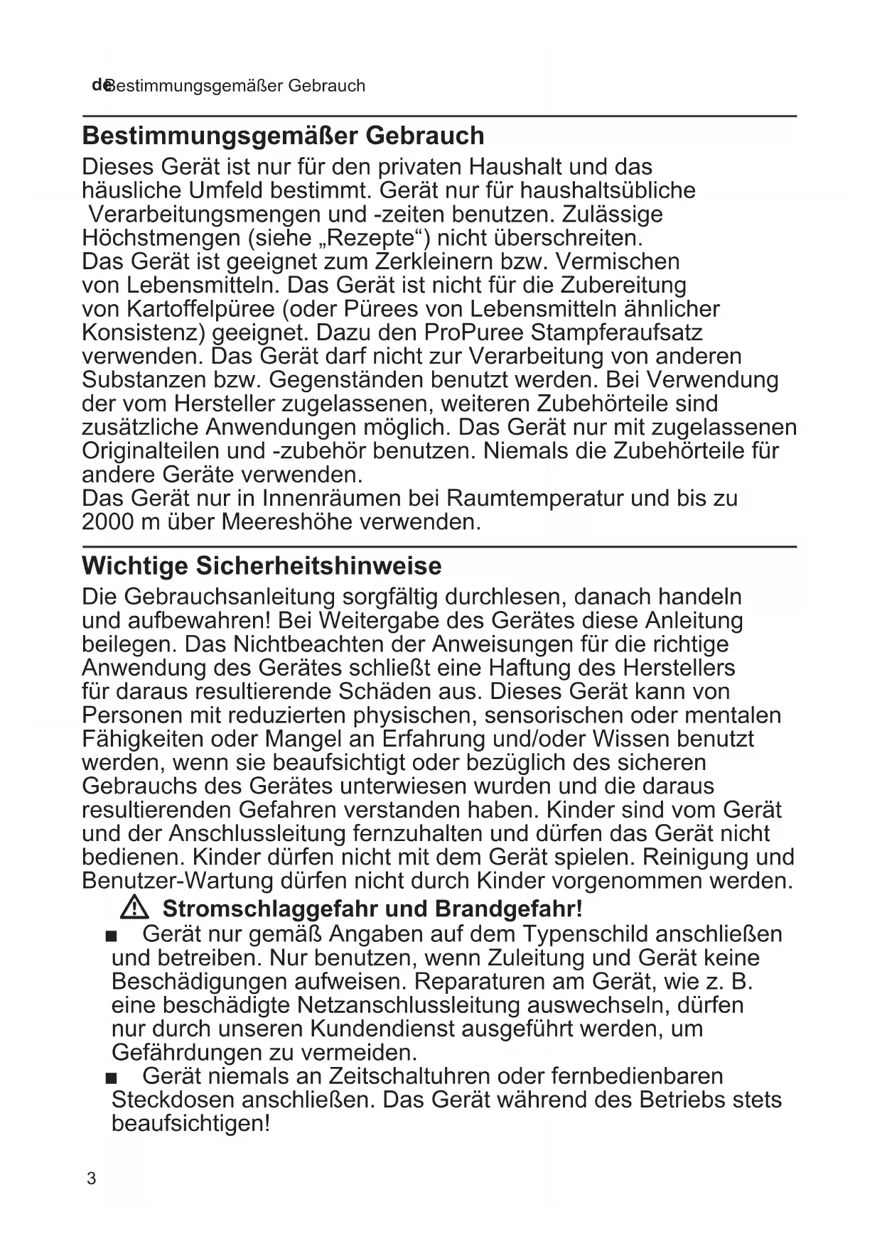 Bestimmungsgemäßer Gebrauch Bestimmungsgemäßer Gebrauch Dieses Gerät ist nur für den privaten Haushalt und das häusliche Umfeld bestimmt. Gerät nur für haushaltsübliche Verarbeitungsmengen und -zeiten benutzen. Zulässige Höchstmengen (siehe „Rezepte“) nicht überschreiten. Das Gerät ist geeignet zum Zerkleinern bzw. Vermischen von Lebensmitteln. Das Gerät ist nicht für die Zubereitung von Kartoffelpüree (oder Pürees von Lebensmitteln ähnlicher Konsistenz) geeignet. Dazu den ProPuree Stampferaufsatz verwenden. Das Gerät darf nicht zur Verarbeitung von anderen Substanzen bzw. Gegenständen benutzt werden. Bei Verwendung der vom Hersteller zugelassenen, weiteren Zubehörteile sind zusätzliche Anwendungen möglich. Das Gerät nur mit zugelassenen Originalteilen und -zubehör benutzen. Niemals die Zubehörteile für andere Geräte verwenden. Das Gerät nur in Innenräumen bei Raumtemperatur und bis zu 2000 m über Meereshöhe verwenden. Wichtige Sicherheitshinweise Die Gebrauchsanleitung sorgfältig durchlesen, danach handeln und aufbewahren! Bei Weitergabe des Gerätes diese Anleitung beilegen. Das Nichtbeachten der Anweisungen für die richtige Anwendung des Gerätes schließt eine Haftung des Herstellers für daraus resultierende Schäden aus. Dieses Gerät kann von Personen mit reduzierten physischen, sensorischen oder mentalen Fähigkeiten oder Mangel an Erfahrung und/oder Wissen benutzt werden, wenn sie beaufsichtigt oder bezüglich des sicheren Gebrauchs des Gerätes unterwiesen wurden und die daraus resultierenden Gefahren verstanden haben. Kinder sind vom Gerät und der Anschlussleitung fernzuhalten und dürfen das Gerät nicht bedienen. Kinder dürfen nicht mit dem Gerät spielen. Reinigung und Benutzer-Wartung dürfen nicht durch Kinder vorgenommen werden. W Stromschlaggefahr und Brandgefahr! ■ Gerät nur gemäß Angaben auf dem Typenschild anschließen und betreiben. Nur benutzen, wenn Zuleitung und Gerät keine Beschädigungen aufweisen. Reparaturen am Gerät, wie z. B. eine beschädigte Netzanschlussleitung auswechseln, dürfen nur durch unseren Kundendienst ausgeführt werden, um Gefährdungen zu vermeiden. ■ Gerät niemals an Zeitschaltuhren oder fernbedienbaren Steckdosen anschließen. Das Gerät während des Betriebs stets beaufsichtigen!4 de Wichtige Sicherheitshinweise ■ Gerät nicht auf oder in die Nähe heißer Oberflächen, wie z. B. Herdplatten, stellen. Das Netzkabel nicht mit heißen Teilen in Berührung bringen oder über scharfe Kanten ziehen. ■ Das Grundgerät niemals in Flüssigkeiten tauchen oder unter fließendes Wasser halten und nicht im Geschirrspüler reinigen. Keinen Dampfreiniger benutzen. Das Gerät nicht mit feuchten Händen benutzen. ■ Wenn Ihr Gerät in Wasser oder eine andere Flüssigkeit fällt, ist es nicht erlaubt, das Gerät weiter zu benutzen. ■ Mixfuß maximal bis zur Markierung Í in das Mixgut eintauchen, sonst besteht Stromschlaggefahr! ■ Das Gerät muss nach jedem Gebrauch, bei nicht vorhandener Aufsicht, vor dem Zusammenbau, Auseinandernehmen oder Reinigen und im Fehlerfall stets vom Netz getrennt werden. W Verletzungsgefahr! ■ Vor dem Auswechseln von Zubehör oder Zusatzteilen, die im Betrieb bewegt werden, muss das Gerät ausgeschaltet und vom Netz getrennt werden. ■ Nach dem Ausschalten läuft der Antrieb kurze Zeit nach. Vollständigen Stillstand des Antriebs abwarten. ■ Niemals in das Mixfußmesser greifen. Das Mixfußmesser niemals mit bloßen Händen reinigen. W Verbrühungsgefahr ■ Vorsicht bei der Verarbeitung von heißem Mixgut. Heißes Mixgut kann bei der Verarbeitung spritzen. W Erstickungsgefahr! Kinder nicht mit Verpackungsmaterial spielen lassen. W Achtung! ■ Es wird empfohlen, das Gerät niemals länger eingeschaltet zu lassen, wie für die Verarbeitung der Lebensmittel notwendig. Nicht im Leerlauf betreiben. ■ Der Mixbecher ist nicht für die Verwendung in der Mikrowelle geeignet. ■ Mixfuß niemals auf heiße Oberflächen stellen oder in sehr heißem Mixgut benutzen. Kochendes Mixgut vor der Verarbeitung auf 80°C oder weniger abkühlen lassen. Bei Verwendung des Stabmixers im Kochtopf den Topf vorher von der Kochstelle nehmen. W Wichtig! Das Gerät nach jeder Verwendung oder nach längerem Nichtgebrauch unbedingt gründlich reinigen. X „Pflege und tägliche Reinigung“ siehe Seite 75