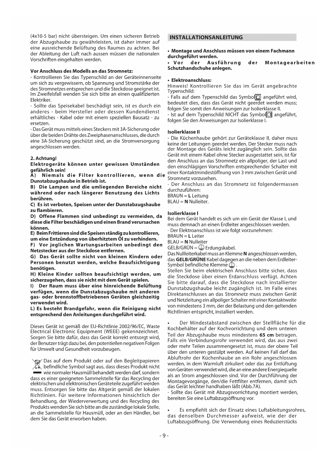 verfügen, wenn die Dunstabzugshaube mit anderen gas- oder brennstoffbetriebenen Geräten gleichzeitig verwendet wird. L) Es besteht Brandgefahr, wenn die Reinigung nicht entsprechend den Anleitungen durchgeführt wird. Dieses Gerät ist gemäß der EU-Richtlinie 2002/96/EC, Waste Electrical Electronic Equipment (WEEE) gekennzeichnet. Sorgen Sie bitte dafür, dass das Gerät korrekt entsorgt wird, der Benutzer trägt dazu bei, den potentiellen negativen Folgen für Umwelt und Gesundheit vorzubeugen. Das auf dem Produkt oder auf den Begleitpapieren befindliche Symbol sagt aus, dass dieses Produkt nicht wie normaler Hausmüll behandelt werden darf, sondern dass es einer geeigneten Sammelstelle für das Recycling der elektrischen und elektronischen Geräteteile zugeführt werden muss. Entsorgen Sie bitte das Altgerät gemäß der lokalen Richtlinien. Für weitere Informationen hinsichtlich der Behandlung, der Wiederverwertung und des Recycling des Produkts wenden Sie sich bitte an die zuständige lokale Stelle, an die Sammelstelle für Hausmüll, oder an den Händler, bei dem Sie das Gerät erworben haben. INSTALLATIONSANLEITUNG