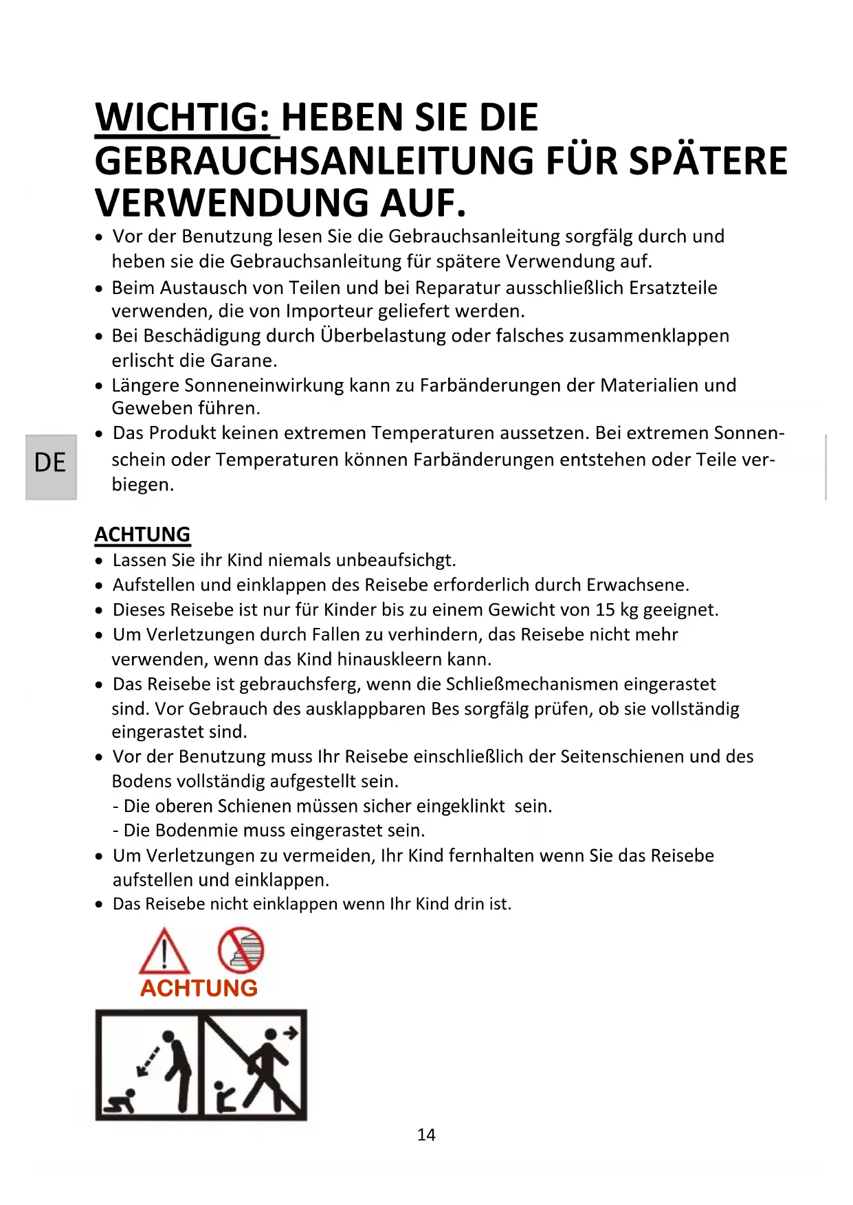 Längere Sonneneinwirkung kann zu Farbänderungen der Materialien und Geweben führen. Das Produkt keinen extremen Temperaturen aussetzen. Bei extremen Sonnen- schein oder Temperaturen können Farbänderungen entstehen oder Teile ver- biegen. ACHTUNG Lassen Sie ihr Kind niemals unbeaufsichtigt. Aufstellen und einklappen des Reisebett erforderlich durch Erwachsene. Dieses Reisebett ist nur für Kinder bis zu einem Gewicht von 15 kg geeignet. Um Verletzungen durch Fallen zu verhindern, das Reisebett nicht mehr verwenden, wenn das Kind hinausklettern kann. Das Reisebett ist gebrauchsfertig, wenn die Schließmechanismen eingerastet sind. Vor Gebrauch des ausklappbaren Betts sorgfältig prüfen, ob sie vollständig eingerastet sind. Vor der Benutzung muss Ihr Reisebett einschließlich der Seitenschienen und des Bodens vollständig aufgestellt sein. - Die oberen Schienen müssen sicher eingeklinkt sein. - Die Bodenmitte muss eingerastet sein. Um Verletzungen zu vermeiden, Ihr Kind fernhalten wenn Sie das Reisebett aufstellen und einklappen. Das Reisebett nicht einklappen wenn Ihr Kind drin ist. ACHTUNG15 Das Kind nicht mit diesem Produkt spielen lassen. Wenn das Produkt nicht benützt wird halten Sie es stets von Kindern fern. Das Reisebett darf grundsätzlich nur mit einem Kind besetzt werden. Das Reisebett nicht verlegen wenn Ihr Kind darin ist. Stellen Sie das Reisebett stets auf einen ebenen, stabilen und festen Untergrund. Dieses Reisebett nicht in die Nähe von Treppen oder Stufen stellen. Stellen Sie sicher, dass sich keine Kinder, Tiere, oder Objekte unter oder in der Nähe des Bettes befinden, wenn ein Kind im Reisebett liegt. Offenes Feuer oder andere starke Hitzequellen wie elektrische Heizstrahler oder gasbeheizte Ofen usw. in der unmittelbaren Umgebung des Reisebett sind eine Gefahr. Es ist zu vermeiden, dass heiße Flüssigkeiten, Stromkabel und andere mögliche Gefahren in Reichweite eines Kindes kommen können. Bringen Sie keine Polsterung oder andere Gegenstände in dem Reisebett an, durch die das Kind heraus klettern könnte. Dem Kind keine Dinge um den Hals hängen (Schnuller schnüre, Kapuzen- bänder etc.). Lassen Sie keine Gegenstände im Bettchen oder in die Nahe vom Bettchen und fügen Sie kleine Polsterungen am Innern des Reisebettes hinzu, die eine Erstickungs– und/oder Erdrosselungsgefahr für das Kind darstellen könnten. Das Reisebett sollte nicht ohne das Untermatratze verwendet werden. Im Reisebett nie mehr als eine Matratze verwenden. Die Matratze sollte so dick sein, dass die interne Höhe (Oberfläche der Matratze bis zur oberen Ecke des Reisebetts) mindestens 500 mm ist. Die Markierung an der Querseite des Bettes gibt die maximale Dicker der Matratze an, die in diesem Kinderbett benutzt werden darf. Mindestgröße der Matratze, die in diesem Bett benutzt werden darf: Länge und Breite der Matratze müssen so beschaffen sein, dass der Spalt zwischen der Matratze und den Seiten und Enden nicht mehr als 30 mm beträgt. Eventuelle zusätzliche Matratzen müssen Abmessungen von mindestens 119 cm Länge und 60 cm Breite und höchstens 122 cm Lange und 63 cm Breite haben. Um Erstickungsgefahr zu vermeiden, verwenden Sie in dem Reisebett KEINE zusätzliche Polsterung wie Wassermatratzen, Matratzen oder Kissen. Alle Montagebeschläge sollten immer gut angezogen, regelmäßig und für jedem gebrauch überprüft und, wenn nötig , erneut angezogen werden. Das Reisebett nicht verwenden, wenn irgendein Teil kaputt, gerissen oder verschwunden ist. Nu Ersatzteile verwenden, wenn sie vom Fabrikanten genehmigt sind. Alle beschädigten Teile sofort austauschen. DE16 MONTIEREN/GEBRAUCH