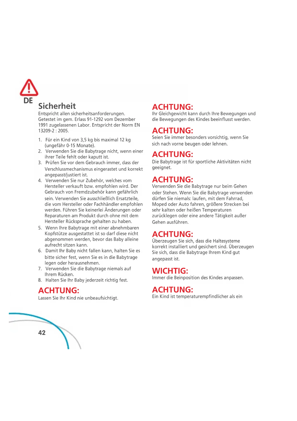 Sicherheit Entspricht allen sicherheitsanforderungen. Getestet im gem. Erlass 91-1292 vom Dezember 1991 zugelassenen Labor. Entspricht der Norm EN 13209-2 : 2005. 1. Für ein Kind von 3,5 kg bis maximal 12 kg (ungefähr 0-15 Monate). 2. Verwenden Sie die Babytrage nicht, wenn einer ihrer Teile fehlt oder kaputt ist.3. Prüfen Sie vor dem Gebrauch immer, dass der Verschlussmechanismus eingerastet und korrekt angepasst/justiert ist. 4. Verwenden Sie nur Zubehör, welches vom Hersteller verkauft bzw. empfohlen wird. Der Gebrauch von Fremdzubehör kann gefährlich sein. Verwenden Sie ausschließlich Ersatzteile, die vom Hersteller oder Fachhändler empfohlen werden. Führen Sie keinerlei Änderungen oder Reparaturen am Produkt durch ohne mit dem Hersteller Rücksprache gehalten zu haben. 5. Wenn Ihre Babytrage mit einer abnehmbaren Kopfstütze ausgestattet ist so darf diese nicht abgenommen werden, bevor das Baby alleine aufrecht sitzen kann.6. Damit Ihr Baby nicht fallen kann, halten Sie es bitte sicher fest, wenn Sie es in die Babytrage legen oder herausnehmen.7. Verwenden Sie die Babytrage niemals auf Ihrem Rücken.8. Halten Sie Ihr Baby jederzeit richtig fest. ACHTUNG: Lassen Sie Ihr Kind nie unbeaufsichtigt. ACHTUNG: Ihr Gleichgewicht kann durch Ihre Bewegungen und die Bewegungen des Kindes beeinflusst werden. ACHTUNG: Seien Sie immer besonders vorsichtig, wenn Sie sich nach vorne beugen oder lehnen. ACHTUNG: Die Babytrage ist für sportliche Aktivitäten nicht geeignet. ACHTUNG: Verwenden Sie die Babytrage nur beim Gehen oder Stehen. Wenn Sie die Babytrage verwenden dürfen Sie niemals: laufen, mit dem Fahrrad, Moped oder Auto fahren, größere Strecken bei sehr kalten oder heißen Temperaturen zurücklegen oder eine andere Tätigkeit außer Gehen ausführen. ACHTUNG: Überzeugen Sie sich, dass die Haltesysteme korrekt installiert und gesichert sind. Überzeugen Sie sich, dass die Babytrage Ihrem Kind gut angepasst ist. WICHTIG: Immer die Beinposition des Kindes anpassen. ACHTUNG: Ein Kind ist temperaturempfindlicher als ein
