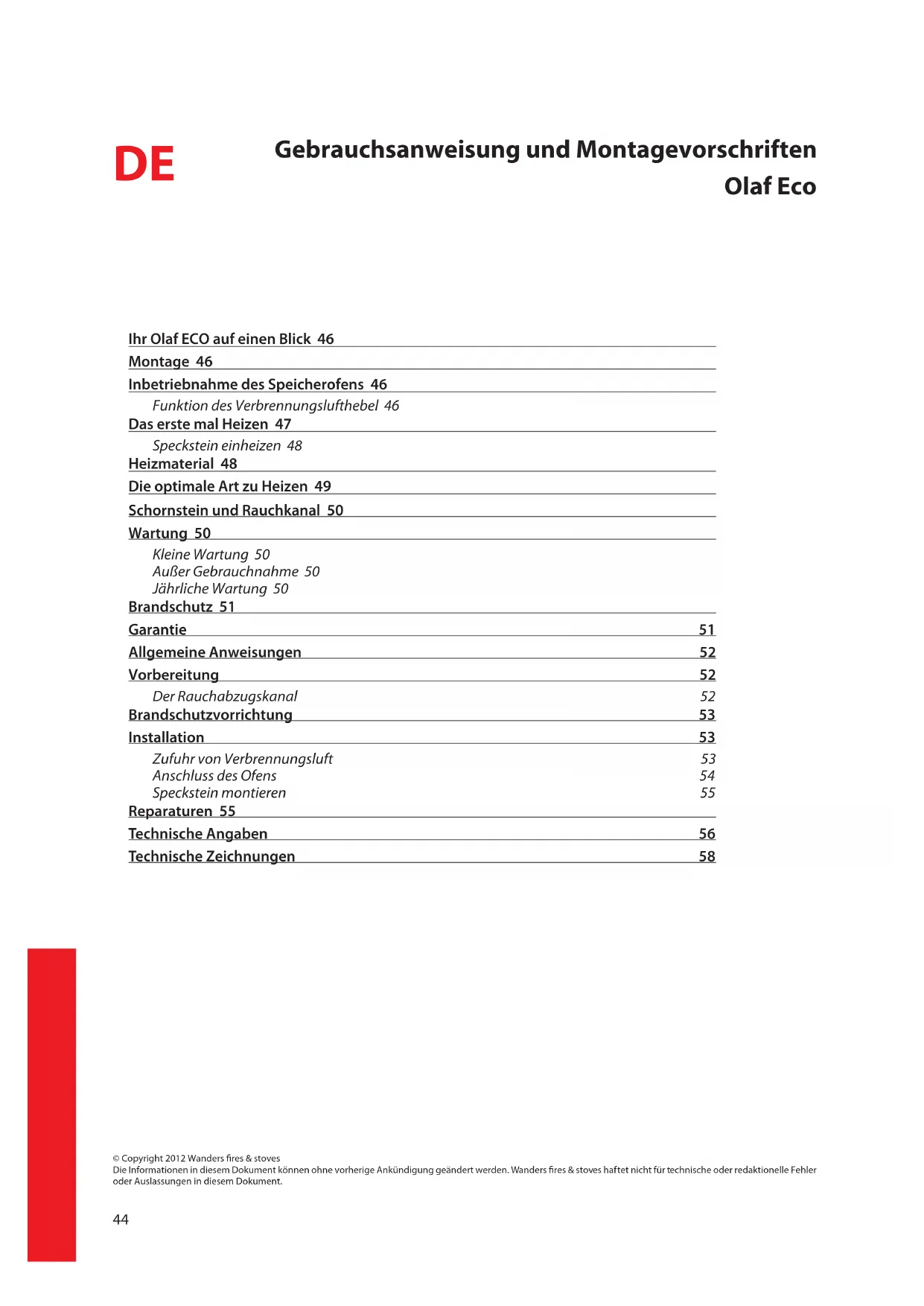 Im ersten Teil dieser Gebrauchsanweisung geben wir Ihnen Tipps und Hinweise für die richtige und sichere Art Ihren Holzofen zu benützen. Im zweiten Teil befinden sich die Installationsvorschriften sowie auch die technischen Angaben dieses Olaf Eco Ofens. Diese sind vor Allem für den Installateur wichtig.