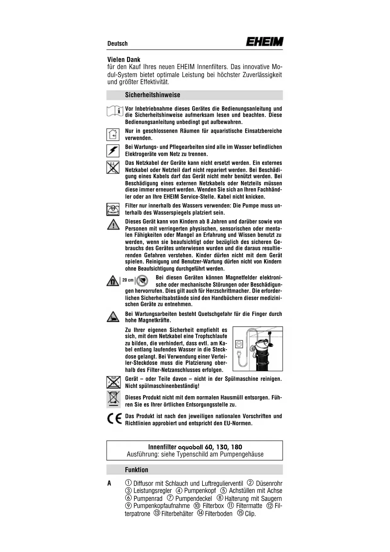 Das Produkt ist nach den jeweiligen nationalen Vorschriften und Richtlinien approbiert und entspricht den EU-Normen. 20 cm Innenfilter aquaball 60, 130, 180 Ausführung: siehe Typenschild am Pumpengehäuse Funktion