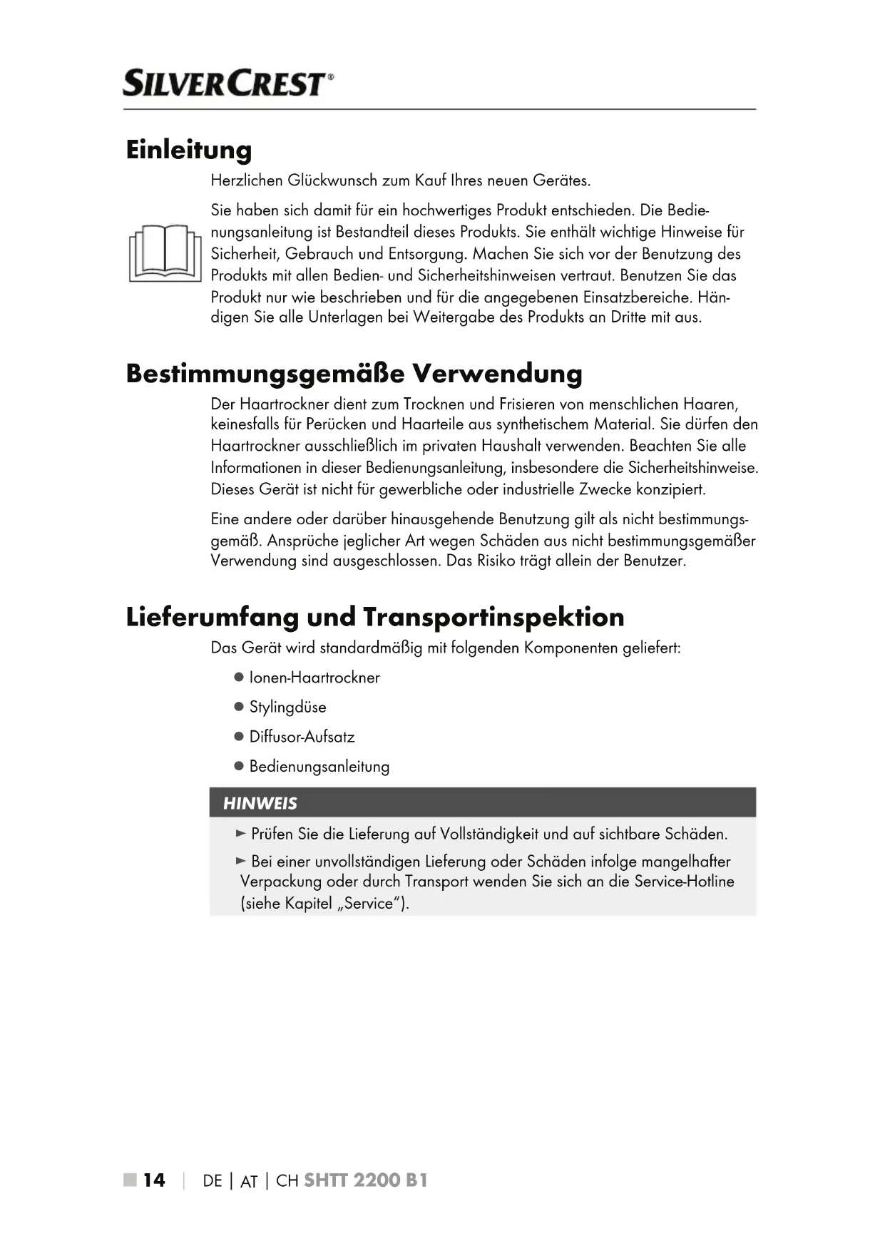Einleitung Herzlichen Glückwunsch zum Kauf Ihres neuen Gerätes. Sie haben sich damit für ein hochwertiges Produkt entschieden. Die Bedie- nungsanleitung ist Bestandteil dieses Produkts. Sie enthält wichtige Hinweise für Sicherheit, Gebrauch und Entsorgung. Machen Sie sich vor der Benutzung des Produkts mit allen Bedien- und Sicherheitshinweisen vertraut. Benutzen Sie das Produkt nur wie beschrieben und für die angegebenen Einsatzbereiche. Hän- digen Sie alle Unterlagen bei Weitergabe des Produkts an Dritte mit aus. Bestimmungsgemäße Verwendung Der Haartrockner dient zum Trocknen und Frisieren von menschlichen Haaren, keinesfalls für Perücken und Haarteile aus synthetischem Material. Sie dürfen den Haartrockner ausschließlich im privaten Haushalt verwenden. Beachten Sie alle Informationen in dieser Bedienungsanleitung, insbesondere die Sicherheitshinweise. Dieses Gerät ist nicht für gewerbliche oder industrielle Zwecke konzipiert. Eine andere oder darüber hinausgehende Benutzung gilt als nicht bestimmungs- gemäß. Ansprüche jeglicher Art wegen Schäden aus nicht bestimmungsgemäßer Verwendung sind ausgeschlossen. Das Risiko trägt allein der Benutzer. Lieferumfang und Transportinspektion Das Gerät wird standardmäßig mit folgenden Komponenten geliefert: ▯ Ionen-Haartrockner ▯ Stylingdüse ▯ Diffusor-Aufsatz ▯ Bedienungsanleitung HINWEIS ► Prüfen Sie die Lieferung auf Vollständigkeit und auf sichtbare Schäden. ► Bei einer unvollständigen Lieferung oder Schäden infolge mangelhafter Verpackung oder durch Transport wenden Sie sich an die Service-Hotline (siehe Kapitel „Service“).DE