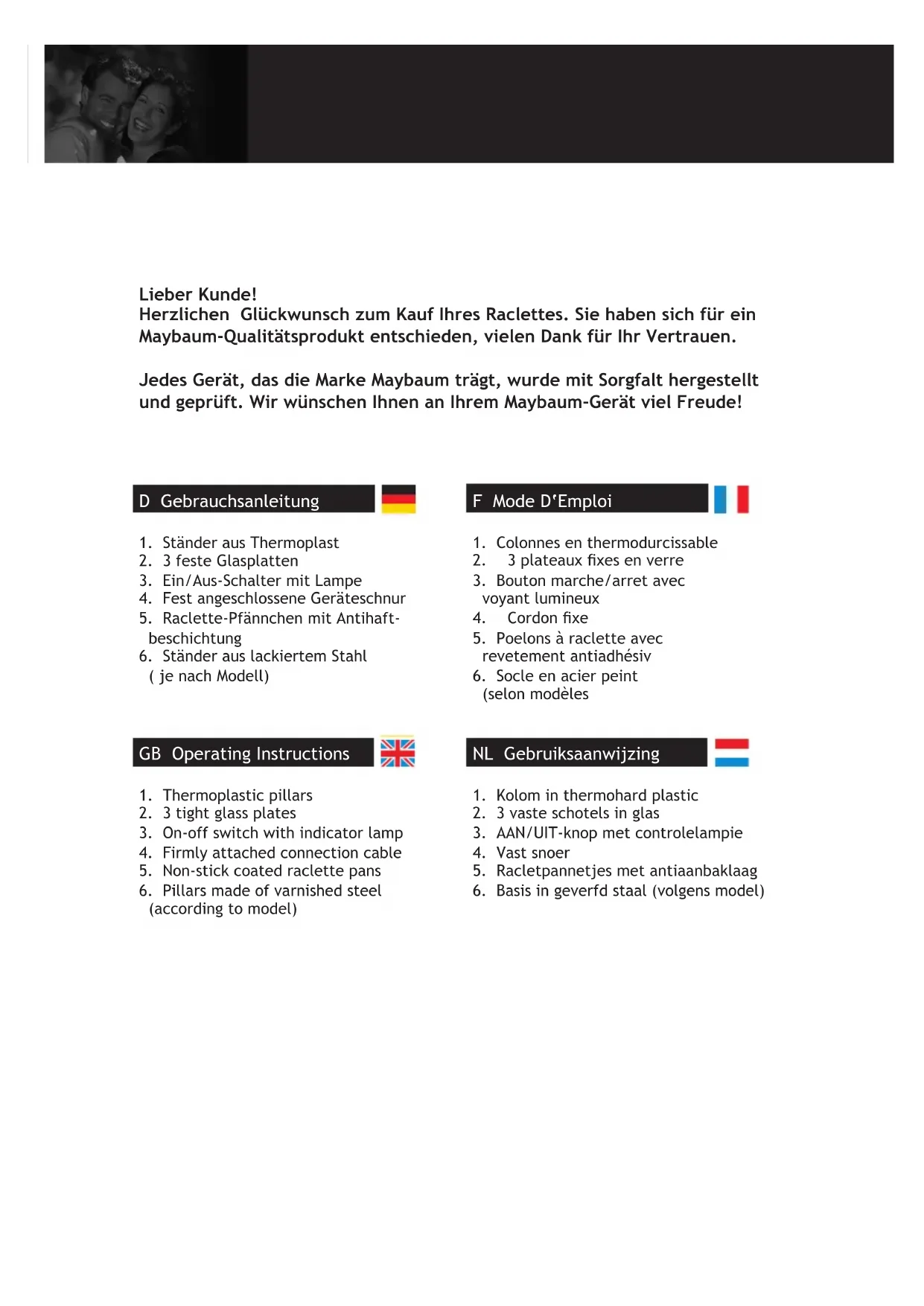 Gebrauchsanleitung Operating Instructions Mode D‘Emploi Gebruiksaanwijzing Glasraclette Glass Raclette Raclette en verre Glazen raclette I/B Version 091104 Art. Nr. R2/R4/R6/R8 Glasraclette 230V~ 350/600/850/1100WLieber Kunde! Herzlichen Glückwunsch zum Kauf Ihres Raclettes. Sie haben sich für ein Maybaum-Qualitätsprodukt entschieden, vielen Dank für Ihr Vertrauen. Jedes Gerät, das die Marke Maybaum trägt, wurde mit Sorgfalt hergestellt und geprüft. Wir wünschen Ihnen an Ihrem Maybaum-Gerät viel Freude! D Gebrauchsanleitung