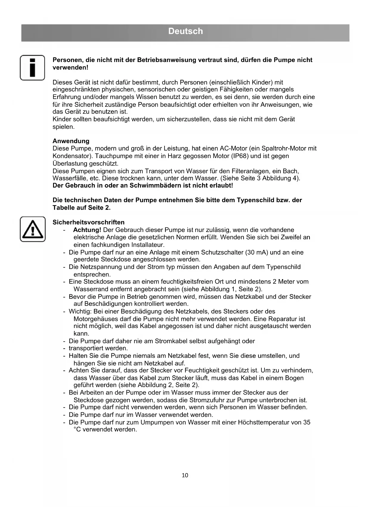 Personen, die nicht mit der Betriebsanweisung vertraut sind, dürfen die Pumpe nicht verwenden! Dieses Gerät ist nicht dafür bestimmt, durch Personen (einschließlich Kinder) mit eingeschränkten physischen, sensorischen oder geistigen Fähigkeiten oder mangels Erfahrung und/oder mangels Wissen benutzt zu werden, es sei denn, sie werden durch eine für ihre Sicherheit zuständige Person beaufsichtigt oder erhielten von ihr Anweisungen, wie das Gerät zu benutzen ist. Kinder sollten beaufsichtigt werden, um sicherzustellen, dass sie nicht mit dem Gerät spielen. Anwendung Diese Pumpe, modern und groß in der Leistung, hat einen AC-Motor (ein Spaltrohr-Motor mit Kondensator). Tauchpumpe mit einer in Harz gegossen Motor (IP68) und ist gegen Überlastung geschützt. Diese Pumpen eignen sich zum Transport von Wasser für den Filteranlagen, ein Bach, Wasserfälle, etc. Diese trocknen kann, unter dem Wasser. (Siehe Seite 3 Abbildung 4). Der Gebrauch in oder an Schwimmbädern ist nicht erlaubt! Die technischen Daten der Pumpe entnehmen Sie bitte dem Typenschild bzw. der Tabelle auf Seite 2. Sicherheitsvorschriften - Achtung! Der Gebrauch dieser Pumpe ist nur zulässig, wenn die vorhandene elektrische Anlage die gesetzlichen Normen erfüllt. Wenden Sie sich bei Zweifel an einen fachkundigen Installateur. - Die Pumpe darf nur an eine Anlage mit einem Schutzschalter (30 mA) und an eine geerdete Steckdose angeschlossen werden. - Die Netzspannung und der Strom typ müssen den Angaben auf dem Typenschild entsprechen. - Eine Steckdose muss an einem feuchtigkeitsfreien Ort und mindestens 2 Meter vom Wasserrand entfernt angebracht sein (siehe Abbildung 1, Seite 2). - Bevor die Pumpe in Betrieb genommen wird, müssen das Netzkabel und der Stecker auf Beschädigungen kontrolliert werden. - Wichtig: Bei einer Beschädigung des Netzkabels, des Steckers oder des Motorgehäuses darf die Pumpe nicht mehr verwendet werden. Eine Reparatur ist nicht möglich, weil das Kabel angegossen ist und daher nicht ausgetauscht werden kann. - Die Pumpe darf daher nie am Stromkabel selbst aufgehängt oder - transportiert werden. - Halten Sie die Pumpe niemals am Netzkabel fest, wenn Sie diese umstellen, und hängen Sie sie nicht am Netzkabel auf. - Achten Sie darauf, dass der Stecker vor Feuchtigkeit geschützt ist. Um zu verhindern, dass Wasser über das Kabel zum Stecker läuft, muss das Kabel in einem Bogen geführt werden (siehe Abbildung 2, Seite 2). - Bei Arbeiten an der Pumpe oder im Wasser muss immer der Stecker aus der Steckdose gezogen werden, sodass die Stromzufuhr zur Pumpe unterbrochen ist. - Die Pumpe darf nicht verwenden werden, wenn sich Personen im Wasser befinden. - Die Pumpe darf nur im Wasser verwendet werden. - Die Pumpe darf nur zum Umpumpen von Wasser mit einer Höchsttemperatur von 35 °C verwendet werden.