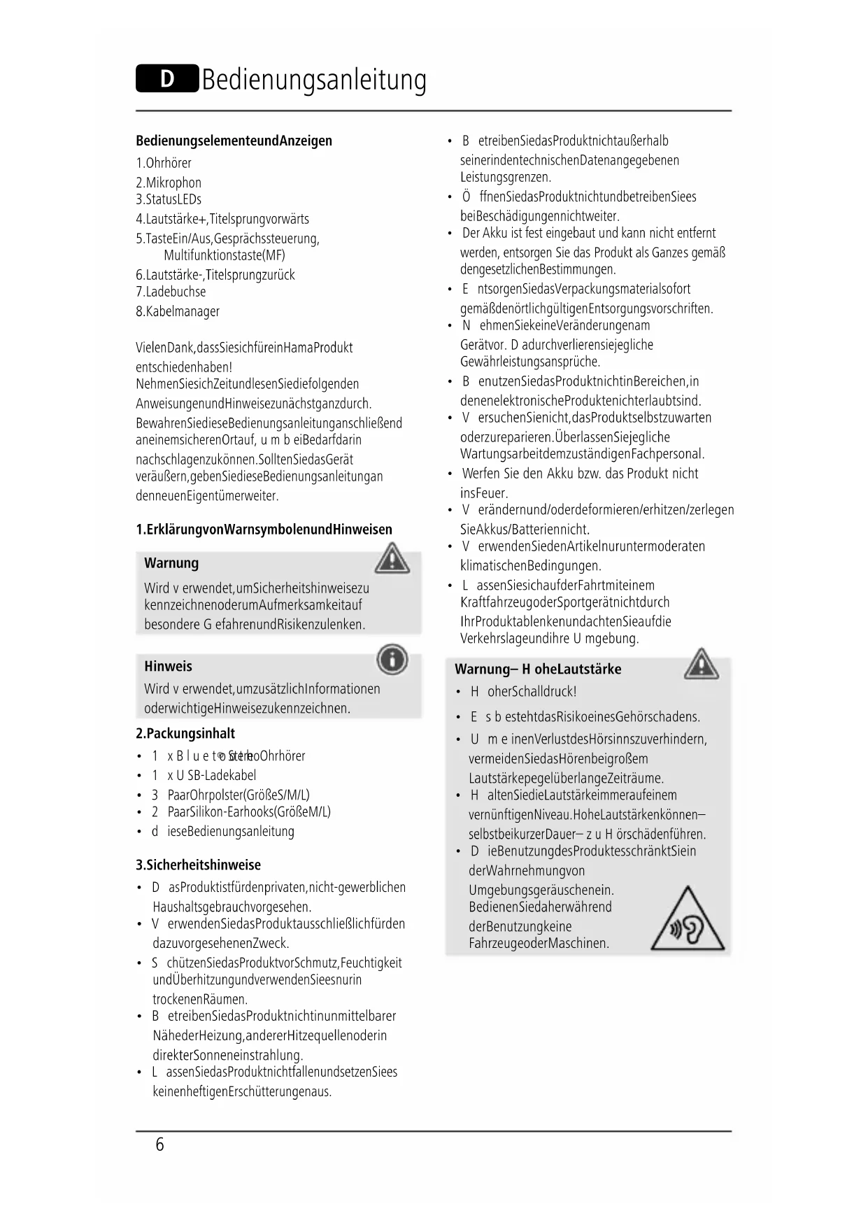 - Die Benutzung des Produktes schränkt Sie in der Wahrnehmung von Umgebungsgeräuschen ein. Bedienen Sie daher während der Benutzung keine Fahrzeuge oder Maschinen.7