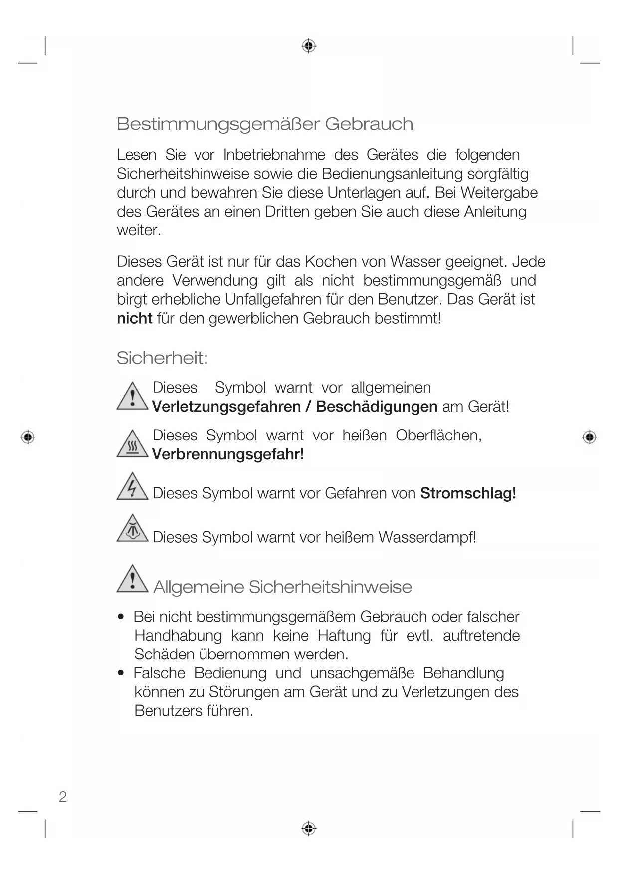 Bestimmungsgemäßer Gebrauch Lesen Sie vor Inbetriebnahme des Gerätes die folgenden Sicherheitshinweise sowie die Bedienungsanleitung sorgfältig durch und bewahren Sie diese Unterlagen auf. Bei Weitergabe des Gerätes an einen Dritten geben Sie auch diese Anleitung weiter. Dieses Gerät ist nur für das Kochen von Wasser geeignet. Jede andere Verwendung gilt als nicht bestimmungsgemäß und birgt erhebliche Unfallgefahren für den Benutzer. Das Gerät ist nicht für den gewerblichen Gebrauch bestimmt! Sicherheit: Dieses Symbol warnt vor allgemeinen Verletzungsgefahren / Beschädigungen am Gerät! Dieses Symbol warnt vor heißen Oberflächen, Verbrennungsgefahr! Dieses Symbol warnt vor Gefahren von Stromschlag! Dieses Symbol warnt vor heißem Wasserdampf! Allgemeine Sicherheitshinweise