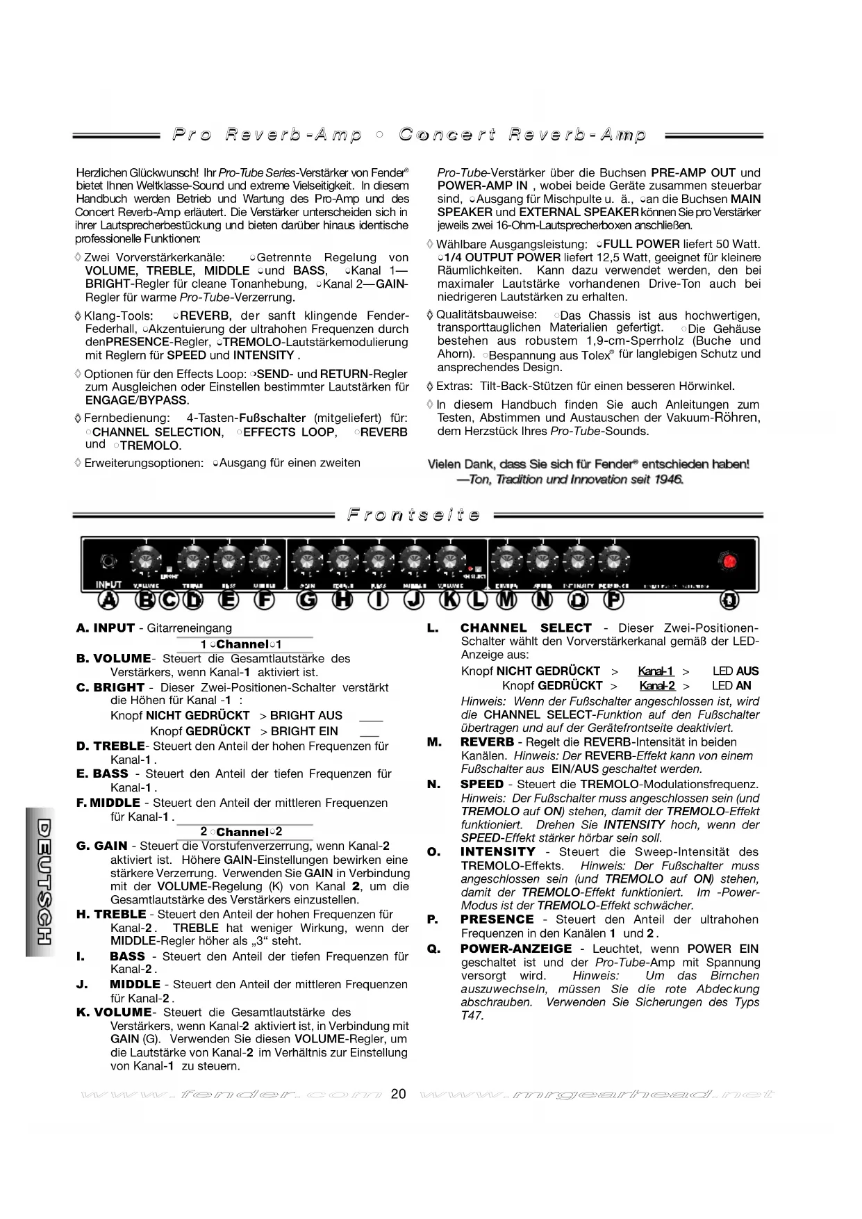 Kanal-2.J. MIDDLE - Steuert den Anteil der mittleren Frequenzenfür Kanal-2.K. VO LU M E - Steuert die Gesamtlautstärke des Verstärkers, wenn Kanal-2 aktiviert ist, in Verbindung mit GAIN (G). Verwenden Sie diesen VOLUME-Regler, umdie Lautstärke von Kanal-2 im Verhältnis zur Einstellungvon Kanal-1 zu steuern. L. CHANNEL SELECT - Dieser Zwei-Positionen- Schalter wählt den Vorverstärkerkanal gemäß der LED-Anzeige aus: Knopf NICHT GEDRÜCKT > K a n a l - 1 > LED A U S Knopf GEDRÜCKT > K a n a l - 2 > L E D A N Hinweis: Wenn der Fußschalter angeschlossen ist, wirddie CHANNEL SELECT-Funktion auf den Fußschalterübertragen und auf der Gerätefrontseite deaktiviert. M. REVERB - Regelt die REVERB-Intensität in beiden Kanälen. Hinweis: Der REVERB-Effekt kann von einemFußschalter aus EIN/AUS geschaltet werden. N. SPEED - Steuert die TREMOLO-Modulationsfrequenz. Hinweis: Der Fußschalter muss angeschlossen sein (und TREMOLO auf ON) stehen, damit der TREMOLO-Effekt funktioniert. Drehen Sie INTENSITY hoch, wenn der SPEED-Effekt stärker hörbar sein soll. O. I N T E N S I T Y - Steuert die Sweep-Intensität des T R E M O L O- E ffekts. Hinweis: Der Fußschalter muss angeschlossen sein (und TREMOLO auf ON) stehen, damit der TREMOLO-Effekt funktioniert. Im -Power-Modus ist der TREMOLO-Effekt schwächer. P. P R E S E N C E - Steuert den Anteil der ultrahohen Frequenzen in den Kanälen 1 und 2. Q. POWER-ANZEIGE - Leuchtet, wenn POWER EIN geschaltet ist und der Pro-Tube-Amp mit Spannung v e r s o rgt wird. Hinweis: Um das Birn c h e n auszuwechseln, müssen Sie die rote Abdeckung abschrauben. Verwenden Sie Sicherungen des Typs T47. Herzlichen Glückwunsch! Ihr P r o - Tube Series- Verstärker von Fender