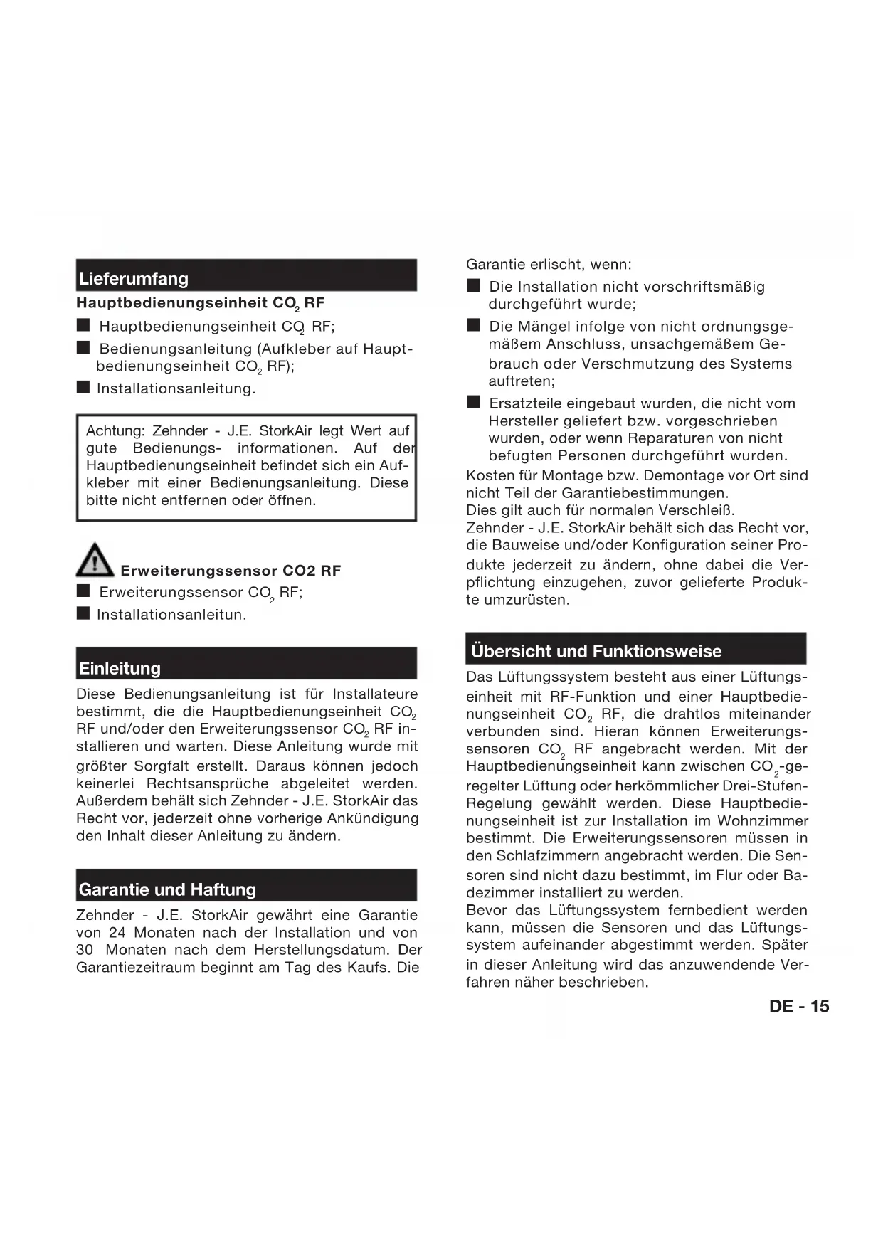 These Bedienungsanleitung ist für Installaure bestimmt, die die Hauptbedienungseinheit CO2 RF und/oder den Erweiterungssensor CO2 RF installieren und warten. These Anleitung wurde mit größter Sorgfalt erstellt. Daraus konnen jedoch keinerlei Rechtsansprüche abgeleitet werden. Außer dem gehalt sich Zehnder - J.E. StorkAir das Recht vor, jederzeit ohne vorherige Ankündigung den Inhalt dieser Anleitung zuändern.