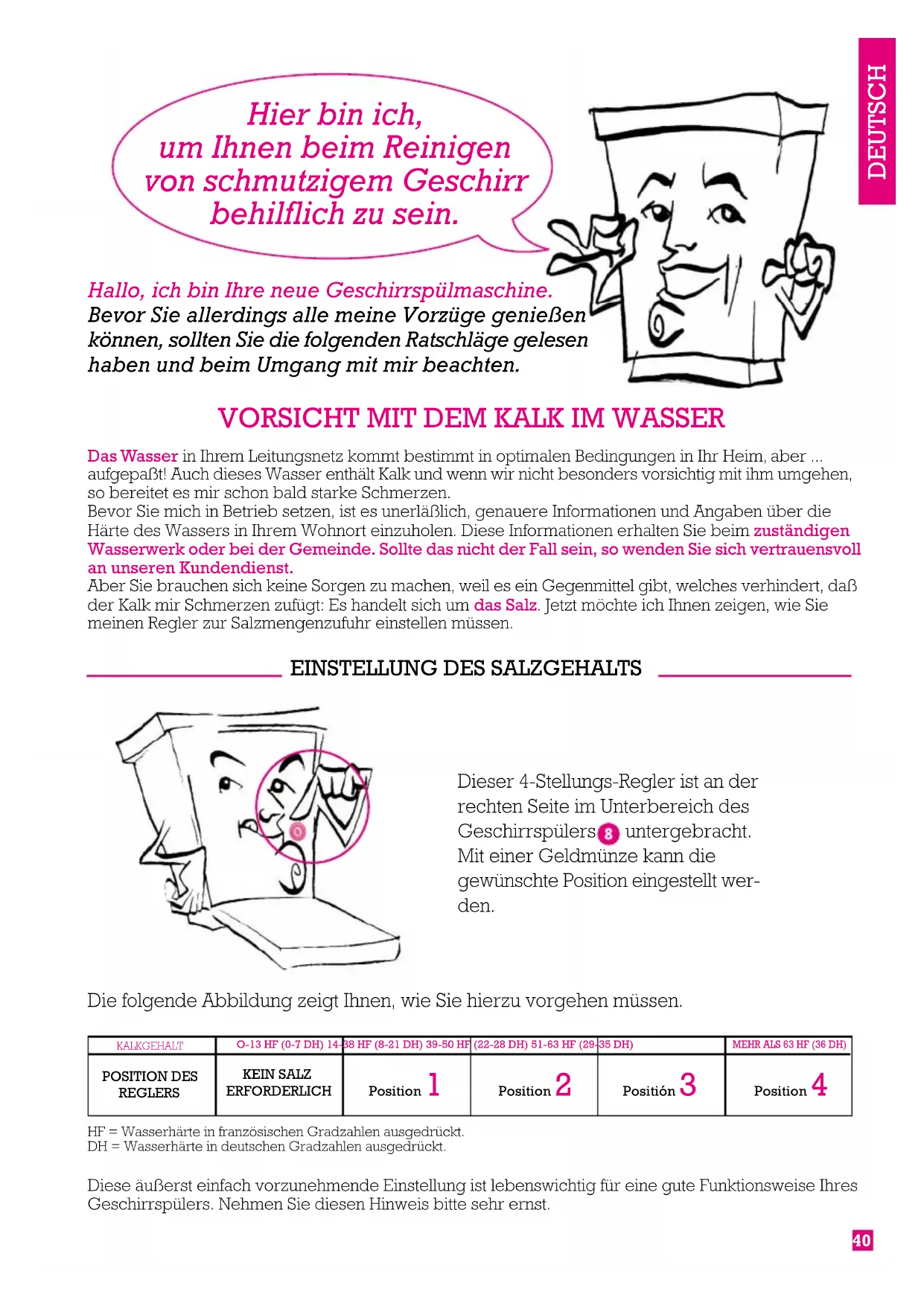 Das Wasser in Ihrem Leitungsnetz kommt bestimmt in optimalen Bedingungen in Ihr Heim, aber ... aufgepaßt! Auch dieses Wasser enthält Kalk und wenn wir nicht besonders vorsichtig mit ihm umgehen,so bereitet es mir schon bald starke Schmerzen.Bevor Sie mich in Betrieb setzen, ist es unerläßlich, genauere Informationen und Angaben über die Härte des Wassers in Ihrem Wohnort einzuholen. Diese Informationen erhalten Sie beim zuständigen Wasserwerk oder bei der Gemeinde. Sollte das nicht der Fall sein, so wenden Sie sich vertrauensvollan unseren Kundendienst.Aber Sie brauchen sich keine Sorgen zu machen, weil es ein Gegenmittel gibt, welches verhindert, daß der Kalk mir Schmerzen zufügt: Es handelt sich um das Salz. Jetzt möchte ich Ihnen zeigen, wie Sie meinen Regler zur Salzmengenzufuhr einstellen müssen. Hier bin ich, um Ihnen beim Reinigen von schmutzigem Geschirr behilflich zu sein.