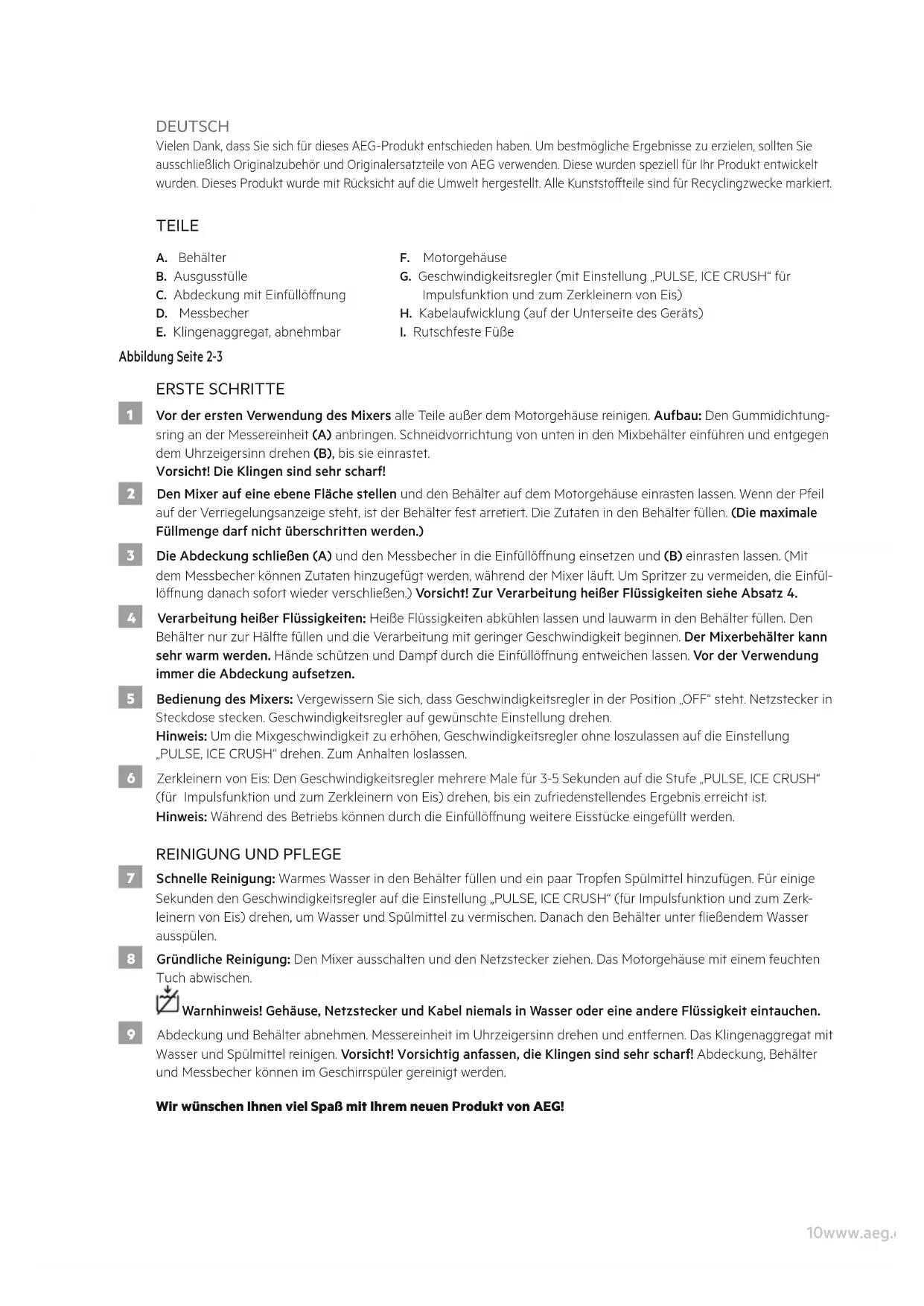 Ingredients Quantity Quality Time Quality Time Quality Time Speed Bread crumbs 100-200 g Coarse 3 sec Medium 3~5 sec Fine 5~10 sec Pulse Almonds 100-200 g 3 sec 3~5 sec 5~10 sec Pulse Peppar 20-100 g 3 sec 5 sec 5~10 sec Pulse DISPOSAL This symbol on the product indicates that this product contains a battery which shall not be disposed with normal household waste. This symbol on the product or on its packaging indicates that the product may not be treated as household waste. To recycle your product, please take it to an oicial collection point or to an AEG service center that can remove and recycle the battery and electric parts in a safe and professional way. Follow your country’s rules for the separate collection of electrical products and rechargeable batteries. AEG reserves the right to change products, information and specications without notice.10www.aeg.com DEUTSCH Vielen Dank, dass Sie sich für dieses AEG-Produkt entschieden haben. Um bestmögliche Ergebnisse zu erzielen, sollten Sie ausschließlich Originalzubehör und Originalersatzteile von AEG verwenden. Diese wurden speziell für Ihr Produkt entwickelt wurden. Dieses Produkt wurde mit Rücksicht auf die Umwelt hergestellt. Alle Kunststoteile sind für Recyclingzwecke markiert. TEILE A. Behälter B. Ausgusstülle C. Abdeckung mit Einfüllönung D. Messbecher E. Klingenaggregat, abnehmbar F. Motorgehäuse G. Geschwindigkeitsregler (mit Einstellung „PULSE, ICE CRUSH“ für Impulsfunktion und zum Zerkleinern von Eis) H. Kabelaufwicklung (auf der Unterseite des Geräts)