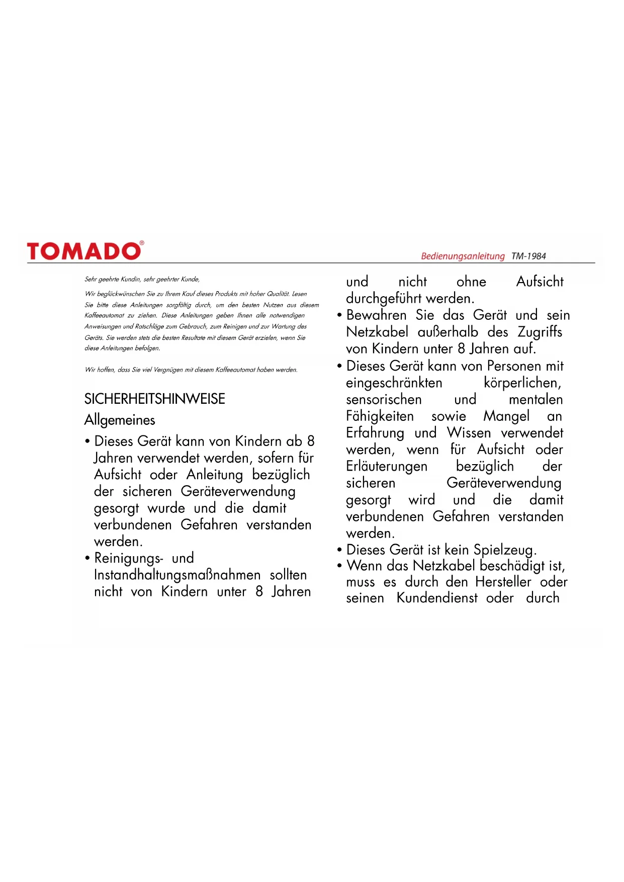 - TOMADO cannot be held responsible for any material damage or personal accident resulting from connecting Warranty regulationsSehr geehrte Kundin, sehr geehrter Kunde, Wir beglückwünschen Sie zu Ihrem Kauf dieses Produkts mit hoher Qualität. Lesen Sie bitte diese Anleitungen sorgfältig durch, um den besten Nutzen aus diesem Kaffeeautomat zu ziehen. Diese Anleitungen geben Ihnen alle notwendigen Anweisungen und Ratschläge zum Gebrauch, zum Reinigen und zur Wartung des Geräts. Sie werden stets die besten Resultate mit diesem Gerät erzielen, wenn Sie diese Anleitungen befolgen. Wir hoffen, dass Sie viel Vergnügen mit diesem Kaffeeautomat haben werden. SICHERHEITSHINWEISE Allgemeines Dieses Gerät kann von Kindern ab 8 Jahren verwendet werden, sofern für Aufsicht oder Anleitung bezüglich der sicheren Geräteverwendung gesorgt wurde und die damit verbundenen Gefahren verstanden werden. Reinigungs- und Instandhaltungsmaßnahmen sollten nicht von Kindern unter 8 Jahren und nicht ohne Aufsicht durchgeführt werden. Bewahren Sie das Gerät und sein Netzkabel außerhalb des Zugriffs von Kindern unter 8 Jahren auf. Dieses Gerät kann von Personen mit eingeschränkten körperlichen, sensorischen und mentalen Fähigkeiten sowie Mangel an Erfahrung und Wissen verwendet werden, wenn für Aufsicht oder Erläuterungen bezüglich der sicheren Geräteverwendung gesorgt wird und die damit verbundenen Gefahren verstanden werden. Dieses Gerät ist kein Spielzeug. Wenn das Netzkabel beschädigt ist, muss es durch den Hersteller oder seinen Kundendienst oder durcheinen qualifizierten Techniker ersetzt werden, um Gefahren zu vermeiden. Dieses Gerät ist für die Verwendung im Haushalt oder für ähnliche Anwendungen vorgesehen, wie: o in Personalküchen von Geschäften, Büros und anderen Arbeitsumgebungen; o auf Bauernhöfen; o von Kunden in Hotels, Motels und in anderen Unterkünften; o in Unterkünften mit Halbpension. Lesen Sie diese Bedienungsanleitung sorgfältig durch, und bewahren Sie sie auf. Verwenden Sie das Gerät ausschließlich entsprechend den Anweisungen in dieser Bedienungsanleitung. Ist das Stromkabel beschädigt, darf das Gerät nicht verwendet werden, die Garantie erlischt sofort, wenn das Gerät durch Nichtbeachtung der Gebrauchsanweisung beschädigt wird. Der Hersteller/Importeur übernimmt keine Haftung für Schäden, die durch Nichtbeachtung der Gebrauchsanweisung, fahrlässige oder unsachgemäße Benutzung entstehen. Ziehen Sie immer den Netzstecker heraus und lassen Sie das Gerät abkühlen: o vor dem verbringen an einen anderen aufstellort; o vor dem lagern; o vor dem anbringen oder entfernen von teilen;o vor dem reinigen oder warten; o nach dem benutzen. Lassen Sie Reparaturen nur von einem qualifizierten Kundendienstzentrum(*) ausführen. (*)Qualifizierter Kundencenter: Kundendienst des Herstellers/Importeurs, der qualifiziert ist, Reparaturen auszuführen, um jegliche Art von Gefahren zu vermeiden. Bitte senden Sie das Gerät in Problemfällen zu diesem Kundencenter zurück. Elektrizität und Wärme Ü berprüfen Sie vor dem Gebrauch, ob die Netzspannung mit der auf dem Gerät angegebenen Spannung übereinstimmt. Schließen Sie das Gerät nur an geerdete Steckdosen (Schukosteckdosen) an. Ü berprüfen Sie das Netzkabel regelmäßig auf Beschädigungen. Betreiben Sie das Gerät nicht mit beschädigtem Netzkabel oder -stecker, wenn es heruntergefallen oder anderweitig beschädigt ist. Wenden Sie sich mit Ü berprüfung, Einstellung und Reparatur an einen autorisierten Kundendienst. Ziehen Sie das Netzkabel immer am Stecker aus der Steckdose. Ziehen Sie nicht am Kabel. Halten Sie das Netzkabel von heißen Oberflächen und heißen Dampf fern. Ziehen Sie immer den Stecker aus der Steckdose, bevor Sie das Gerät an einen anderen Platz stellen. Das Gerät darf nicht mit Hilfe einer externen Zeitschaltuhr oder eines separaten Systems mit Fernbedienung eingeschaltet werden. Sollte sich ein Verlängerungskabel nicht vermeiden lassen, so achten Sie bitte darauf, dass es mit 10A abgesichert ist. Geringerwertige Verlängerungskabel können überhitzen. Achten Sie darauf, dass niemand über das Anschlusskabel stolpern kann. Zur Vermeidung von Leitungsüberlastung betreiben Sie bitte keinen weiteren starken Verbraucher am gleichen Stromkreis. Tauchen Sie Gerät, Netzkabel oder-stecker nicht in Wasser oder sonstige Flüssigkeiten ein, um Stromschlag zu vermeiden. Fassen Sie das Gerät nicht an, wenn es ins Wasser gefallen ist. Ziehen Sien den Netzstecker aus der Steckdose, schalten Sie das Gerät aus und verwenden Sie es nciht mehr. Verwenden Sie das Gerät nicht in unmittelbarer Nähe vond Wärmequellen wie Herd oder Backofen.Gebrauch Die Benutzung von nicht Original Zubehörteilen kann zu Verletzungen führen. Verwenden Sie das Gerät nur in trockenen Innenräumen und nicht in der Nähe von Wasser. Tauchen Sie das Gerät und den Netzstecker nicht in Wasser oder andere Flüssigkeiten. Es besteht Lebensgefahr durch Stromschlag! Zu Einschränkung von Stromschlag brauchen Sie die das Gerät nicht draußen oder auf nassen Oberflächen. Stellen Sie das Gerät auf eine stabile, ebene Oberfläche, von der es nicht herunter fallen kann. Verwenden Sie das Gerät auf einem flachen, trockenen, hitzebeständigen und nicht lackierten Möbel. Stellen Sie das Gerät in einem Mindestabstand von 5 cm von der Wand oder brennbaren Objekten (wie z. B. Vorhängen, Kerzen oder Handtüchern) auf. Stellen Sie das Gerät auf eine stabile, ebene Oberfläche und nicht in die Nähe von heißen Gegenständen oder offenen Flammen (z.B. Heizplatten). Ziehen Sie den Netzstecker: nach jedem Gebrauch; bei einer Störung während des Betriebes; vor jeder Reinigung. Ziehen Sie den Netzstecker aus der Steckdose, wenn das Gerät nicht in Gebrauch ist und vor der Reinigung. Achten Sie darauf, dass das Netzkabel nicht über scharfe Kanten hängt und halten Sie es von heißen Gegenständen und offenen Flammen fern. Benutzen Si