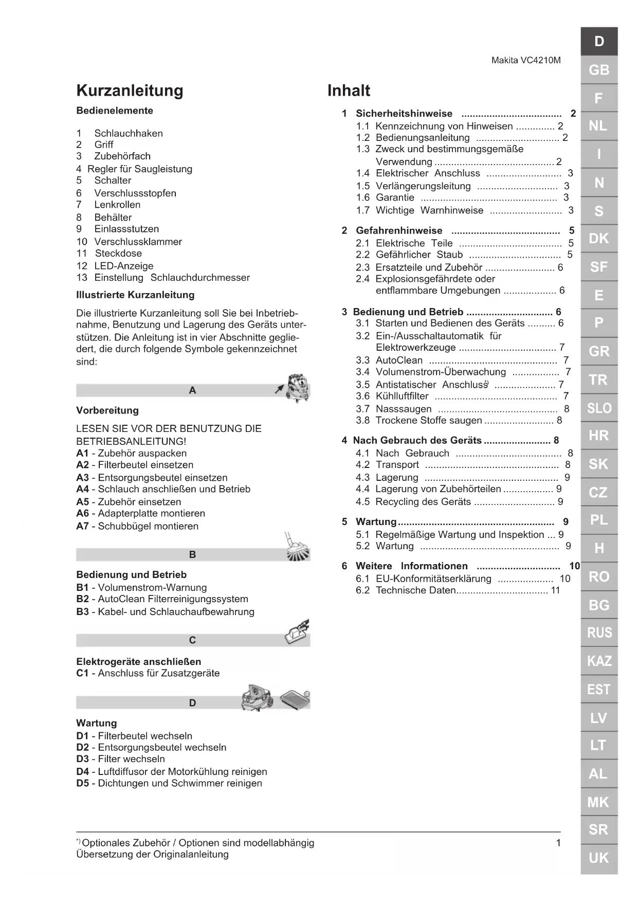 Makita VC4210M 1 Sicherheitshinweise Dieses Dokument enthält die Kurzanleitung sowie wichtige Sicherheitsinformationen zum Gerät. Sie müssen diese Bedienungsanleitung sorgfältig le- sen, bevor Sie das Gerät zum ersten Mal in Betrieb nehmen. Heben Sie diese Anleitung für die spätere Verwendung auf. Weitere Informationen Weitere Informationen zum Gerät finden Sie auf unserer Internetseite www.makita.com. Bei Fragen wenden Sie sich bitte an den Makita-Service in Ihrem Land. Siehe Rückseite dieses Dokuments.