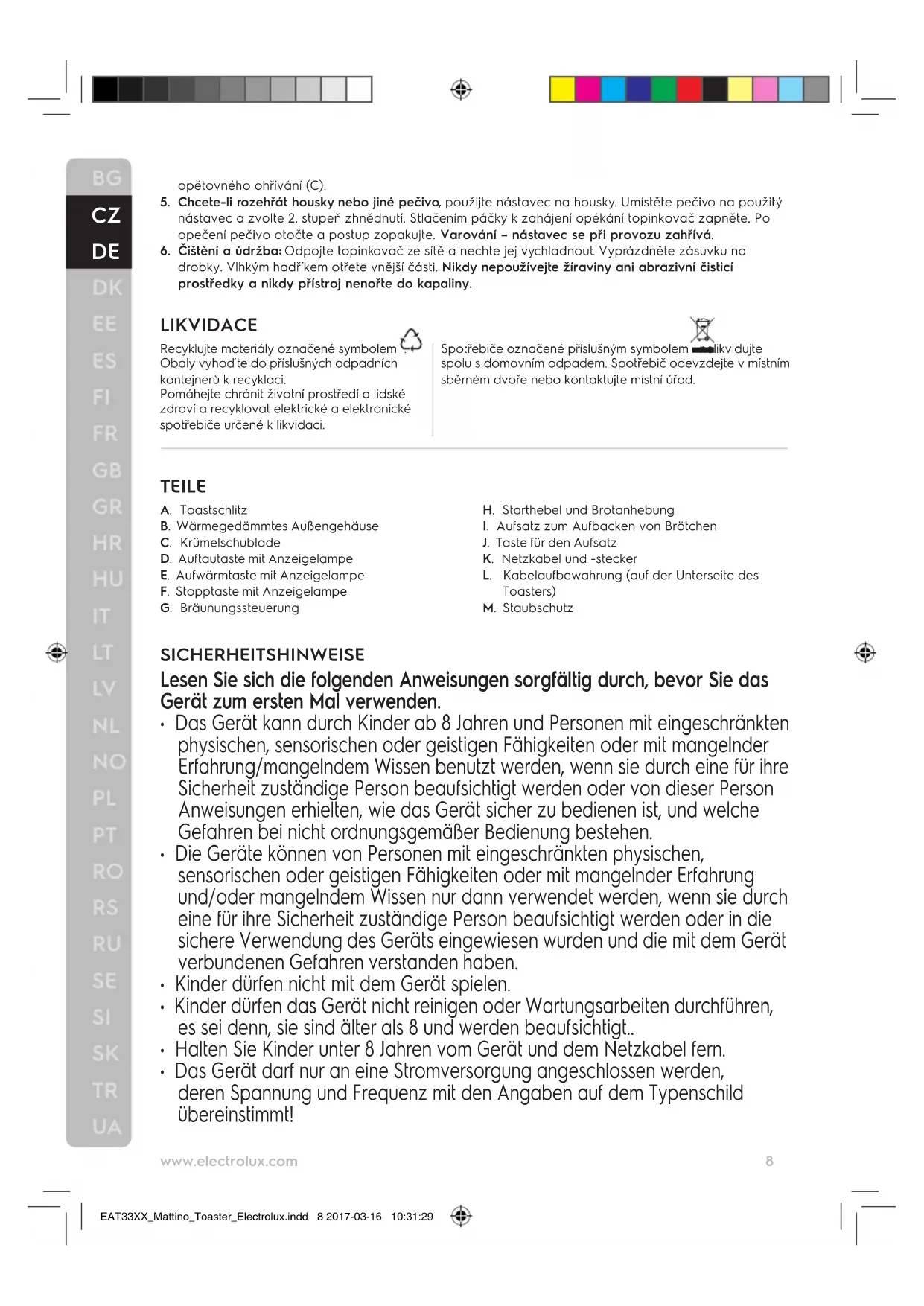 - Das Gerät darf nur an eine Stromversorgung angeschlossen werden, deren Spannung und Frequenz mit den Angaben auf dem Typenschild übereinstimmt! EAT33XX_Mattino_Toaster_Electrolux.indd 8 2017-03-16 10:31:299 www.electrolux.com