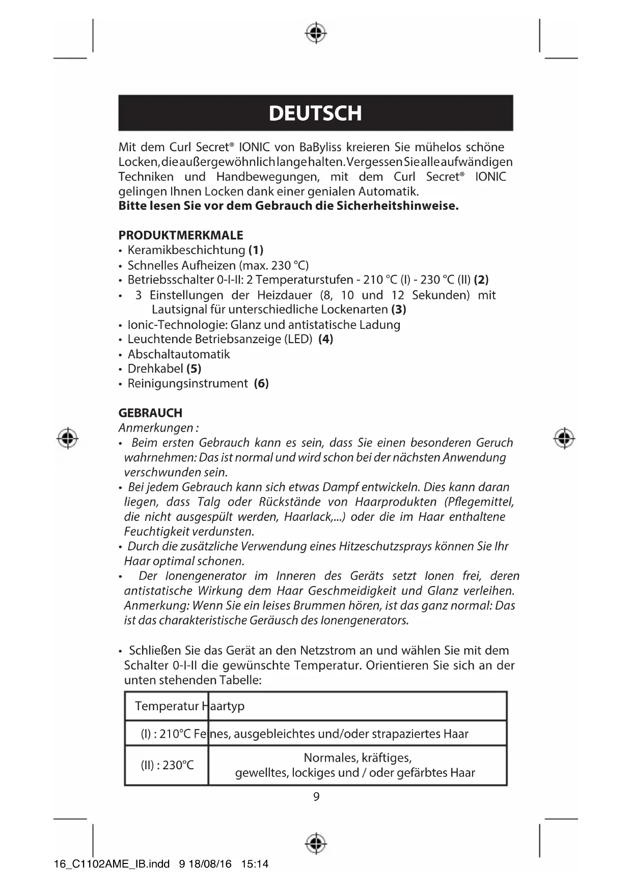 - The cleaning tool can be reused many times. Simply remove the felt pad, rinse it in warm soapy water and leave to dry before reusing. Once unplugged and cooled, the appliance housing may be wiped with a damp cloth. Ensure the appliance is completely dry before plugging it in again. 16_C1102AME_IB.indd 8 18/08/16 15:149 Mit dem Curl Secret® IONIC von BaByliss kreieren Sie mühelos schöne Locken, die außergewöhnlich lange halten. Vergessen Sie alle aufwändigen Techniken und Handbewegungen, mit dem Curl Secret® IONIC gelingen Ihnen Locken dank einer genialen Automatik. Bitte lesen Sie vor dem Gebrauch die Sicherheitshinweise. PRODUKTMERKMALE
