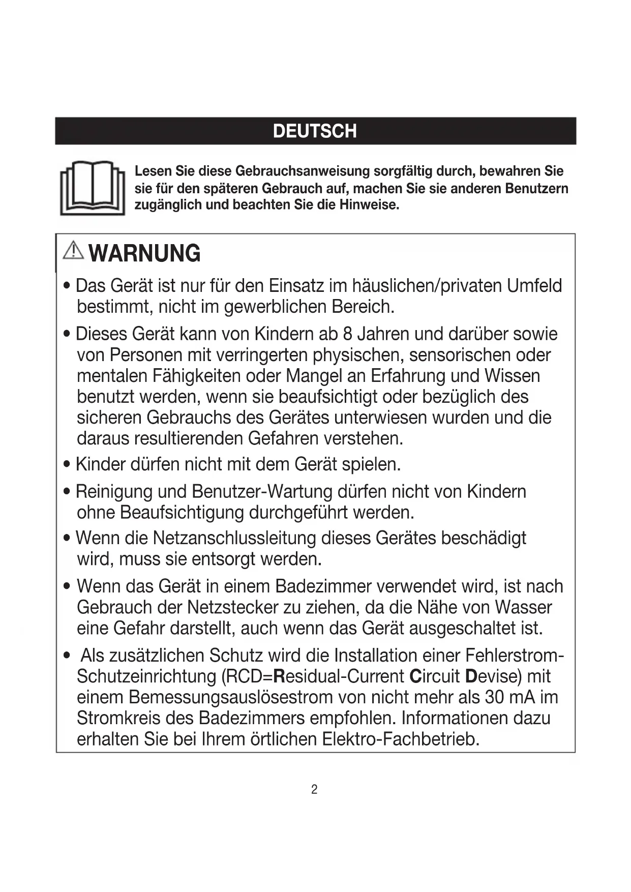 - Als zusätzlichen Schutz wird die Installation einer Fehlerstrom- Schutzeinrichtung (RCD=Residual-Current Circuit Devise) mit einem Bemessungsauslösestrom von nicht mehr als 30 mA im Stromkreis des Badezimmers empfohlen. Informationen dazu erhalten Sie bei Ihrem örtlichen Elektro-Fachbetrieb. Lesen Sie diese Gebrauchsanweisung sorgfältig durch, bewahren Sie sie für den späteren Gebrauch auf, machen Sie sie anderen Benutzern zugänglich und beachten Sie die Hinweise.2 3
