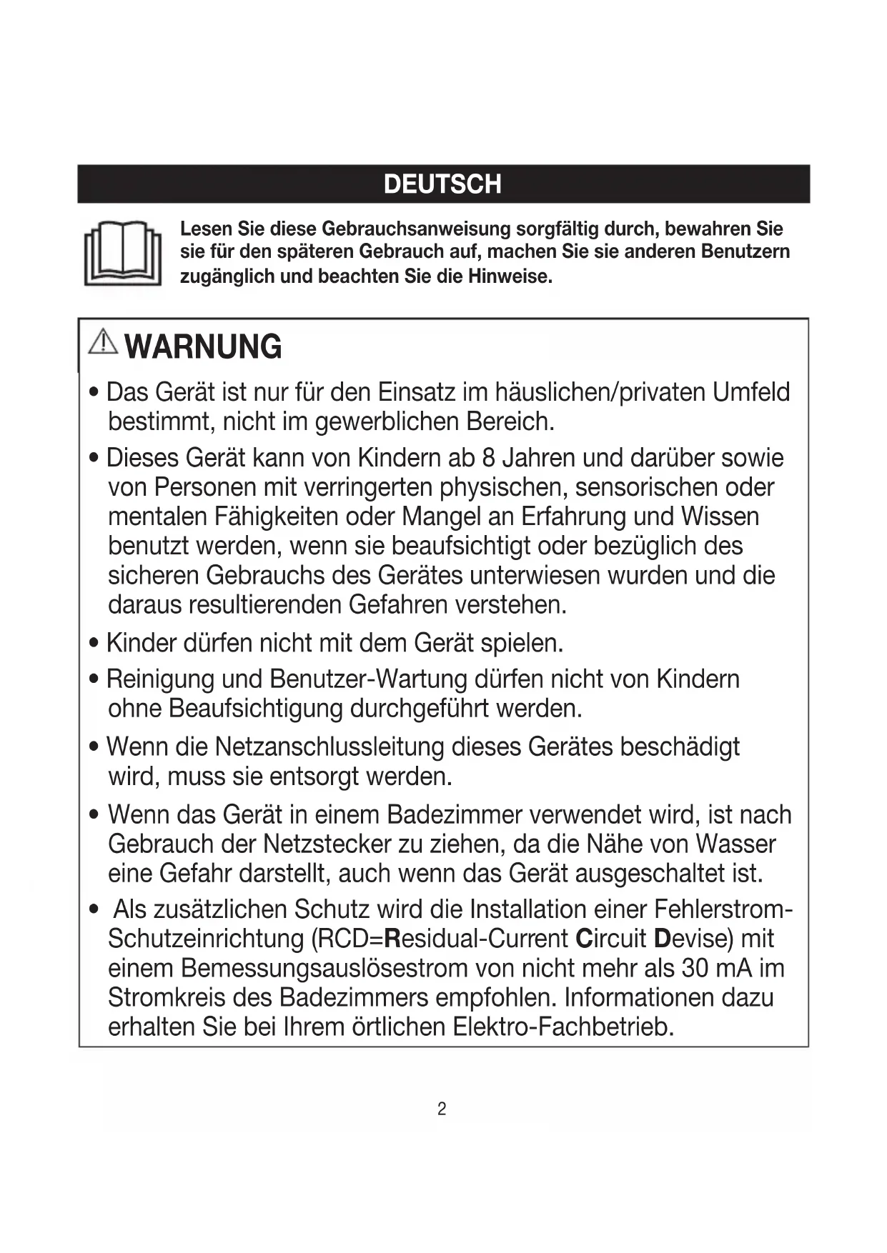Als zusätzlichen Schutz wird die Installation einer Fehlerstrom-Schutzeinrichtung (RCD=Residual-Current Circuit Devise) mit einem Bemessungsauslösestrom von nicht mehr als 30mA im Stromkreis des Badezimmers empfohlen. Informationen dazu erhalten Sie bei Ihrtem örtlichen Elektro-Fachbetrieb.