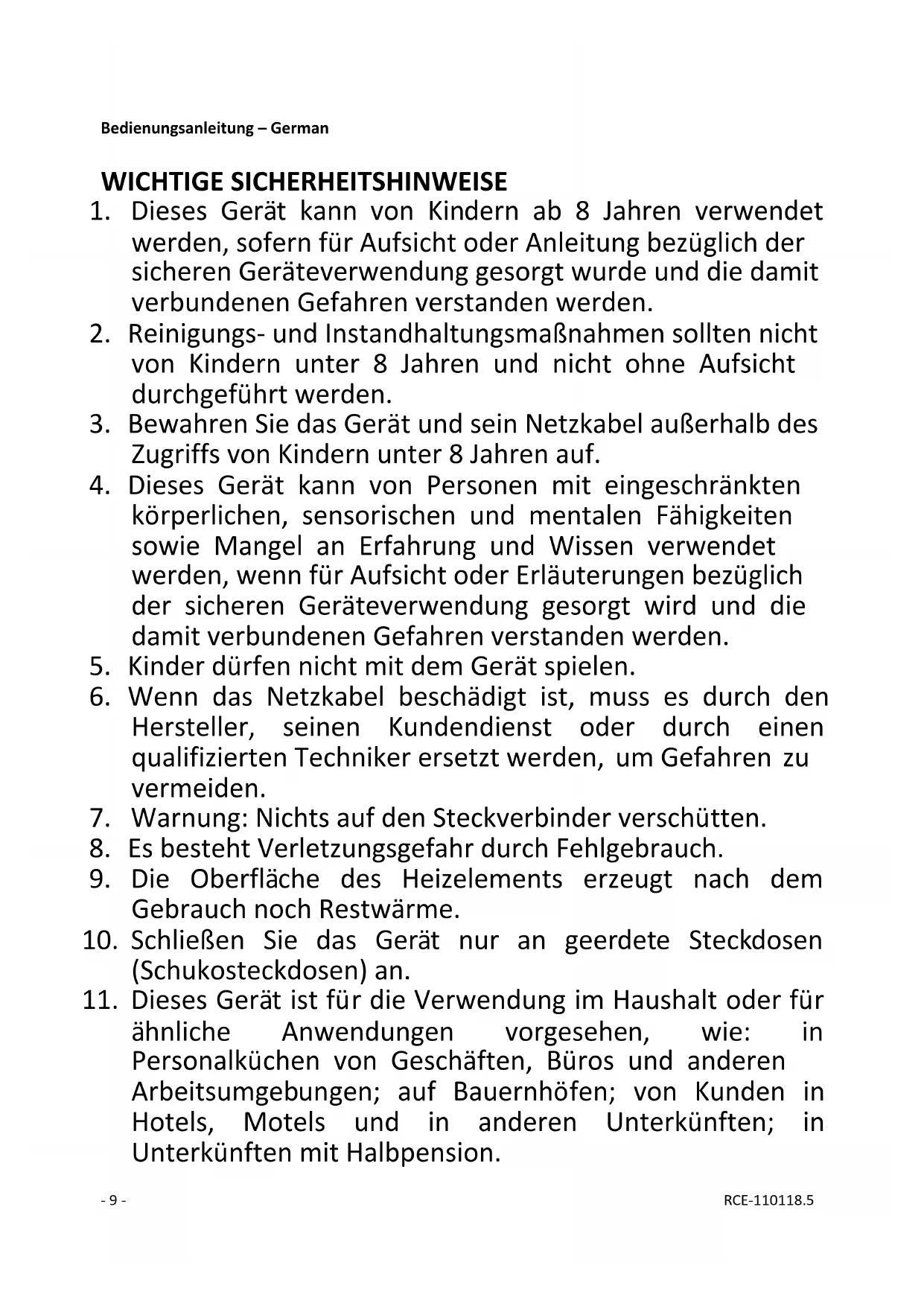 - Dieses Gerät kann von Kindern ab 8 Jahren verwendet werden, sofern für Aufsicht oder Anleitung bezüglich der sicheren Geräteverwendung gesört wurde und die damit verbundenen Gefahren verstanden werden.