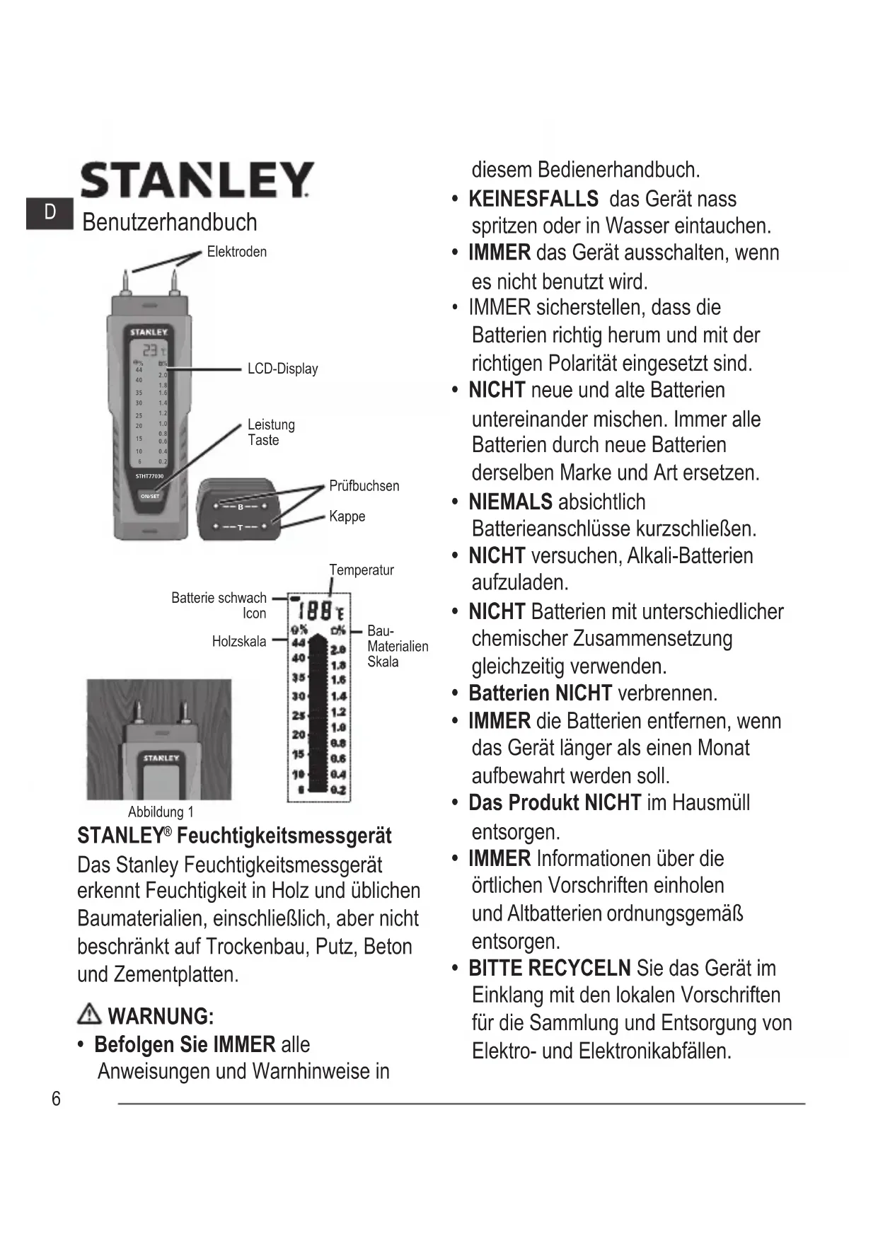 Das Stanley Feuchtigkeitsmessgeräter kennt Feuchtigkeit in Holz und üblichen Baumaterialien, einschließlich, aber nicht beschränkt auf Trockenbau, Putz, Beton und Zementplatten.