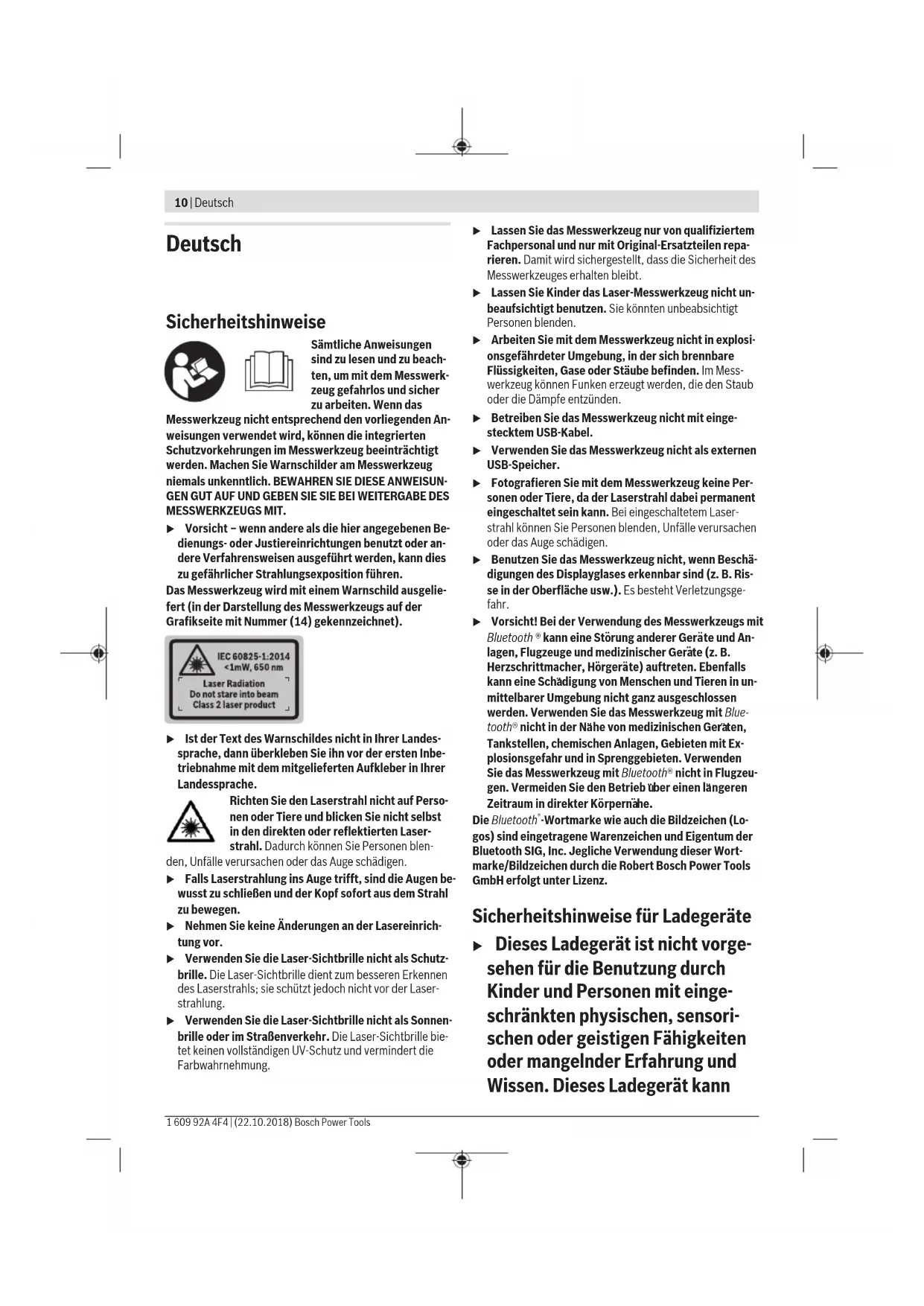 BT 150 0 601 096 B00 (25) (26) (27)10 | Deutsch 1 609 92A 4F4 | (22.10.2018) Bosch Power Tools Deutsch Sicherheitshinweise Sämtliche Anweisungen sind zu lesen und zu beach- ten, um mit dem Messwerk- zeug gefahrlos und sicher zu arbeiten. Wenn das Messwerkzeug nicht entsprechend den vorliegenden An- weisungen verwendet wird, können die integrierten Schutzvorkehrungen im Messwerkzeug beeinträchtigt werden. Machen Sie Warnschilder am Messwerkzeug niemals unkenntlich. BEWAHREN SIE DIESE ANWEISUN- GEN GUT AUF UND GEBEN SIE SIE BEI WEITERGABE DES MESSWERKZEUGS MIT. u Vorsicht – wenn andere als die hier angegebenen Be- dienungs- oder Justiereinrichtungen benutzt oder an- dere Verfahrensweisen ausgeführt werden, kann dies zu gefährlicher Strahlungsexposition führen. Das Messwerkzeug wird mit einem Warnschild ausgelie- fert (in der Darstellung des Messwerkzeugs auf der Grafikseite mit Nummer (14) gekennzeichnet). u Ist der Text des Warnschildes nicht in Ihrer Landes- sprache, dann überkleben Sie ihn vor der ersten Inbe- triebnahme mit dem mitgelieferten Aufkleber in Ihrer Landessprache. Richten Sie den Laserstrahl nicht auf Perso- nen oder Tiere und blicken Sie nicht selbst in den direkten oder reflektierten Laser- strahl. Dadurch können Sie Personen blen- den, Unfälle verursachen oder das Auge schädigen. u Falls Laserstrahlung ins Auge trifft, sind die Augen be- wusst zu schließen und der Kopf sofort aus dem Strahl zu bewegen. u Nehmen Sie keine Änderungen an der Lasereinrich- tung vor. u Verwenden Sie die Laser-Sichtbrille nicht als Schutz- brille. Die Laser-Sichtbrille dient zum besseren Erkennen des Laserstrahls; sie schützt jedoch nicht vor der Laser- strahlung. u Verwenden Sie die Laser-Sichtbrille nicht als Sonnen- brille oder im Straßenverkehr. Die Laser-Sichtbrille bie- tet keinen vollständigen UV-Schutz und vermindert die Farbwahrnehmung. u Lassen Sie das Messwerkzeug nur von qualifiziertem Fachpersonal und nur mit Original-Ersatzteilen repa- rieren. Damit wird sichergestellt, dass die Sicherheit des Messwerkzeuges erhalten bleibt. u Lassen Sie Kinder das Laser-Messwerkzeug nicht un- beaufsichtigt benutzen. Sie könnten unbeabsichtigt Personen blenden. u Arbeiten Sie mit dem Messwerkzeug nicht in explosi- onsgefährdeter Umgebung, in der sich brennbare Flüssigkeiten, Gase oder Stäube befinden. Im Mess- werkzeug können Funken erzeugt werden, die den Staub oder die Dämpfe entzünden. u Betreiben Sie das Messwerkzeug nicht mit einge- stecktem USB-Kabel. u Verwenden Sie das Messwerkzeug nicht als externen USB-Speicher. u Fotografieren Sie mit dem Messwerkzeug keine Per- sonen oder Tiere, da der Laserstrahl dabei permanent eingeschaltet sein kann. Bei eingeschaltetem Laser- strahl können Sie Personen blenden, Unfälle verursachen oder das Auge schädigen. u Benutzen Sie das Messwerkzeug nicht, wenn Beschä- digungen des Displayglases erkennbar sind (z. B. Ris- se in der Oberfläche usw.). Es besteht Verletzungsge- fahr. u Vorsicht! Bei der Verwendung des Messwerkzeugs mit Bluetooth ® kann eine Sto