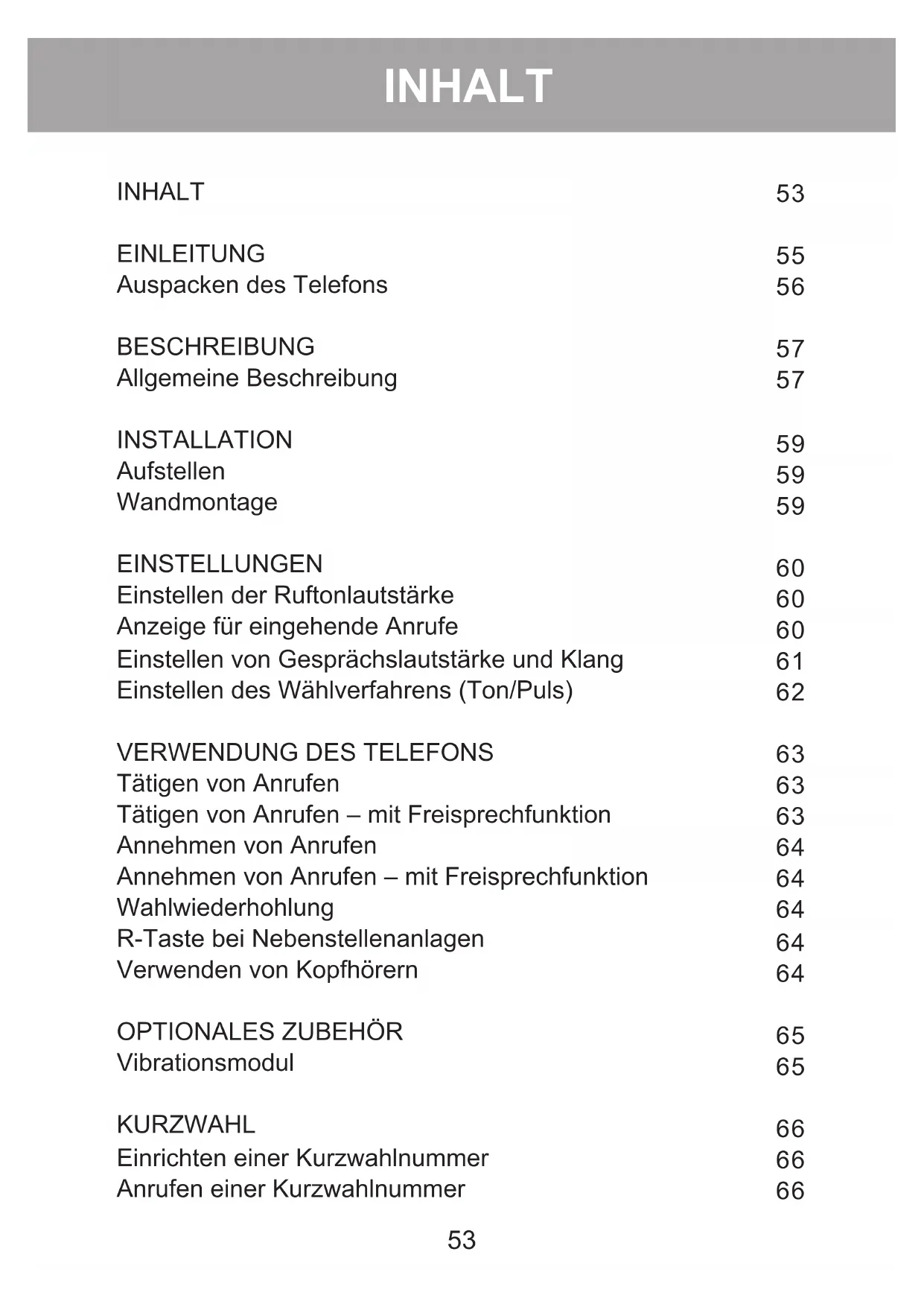 INHALT EINLEITUNG Auspacken des Telefons BESCHREIBUNG Allgemeine Beschreibung INSTALLATION Aufstellen Wandmontage EINSTELLUNGEN Einstellen der Ruftonlautstärke Anzeige für eingehende Anrufe Einstellen von Gesprächslautstärke und Klang Einstellen des Wählverfahrens (Ton/Puls)