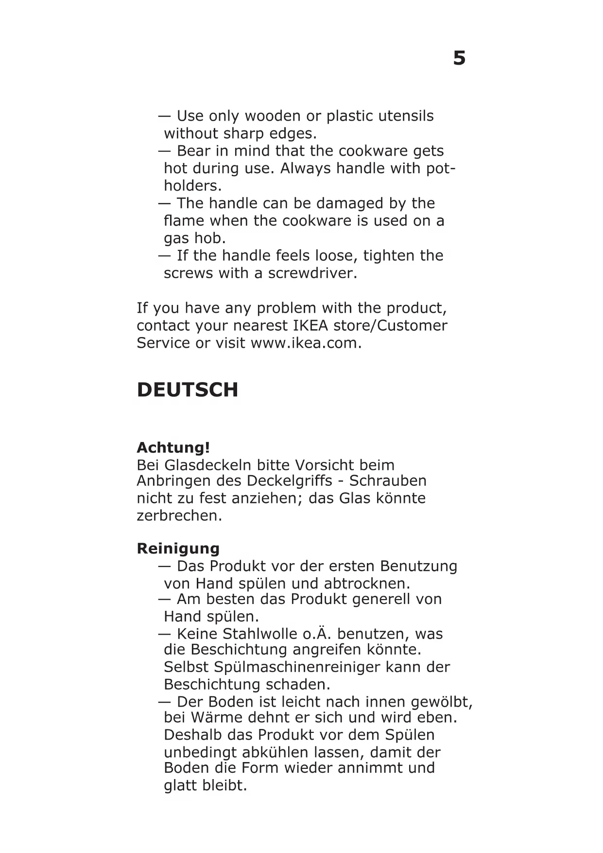 中文 44 繁中 45 한국어 46 日本語 47 BAHASA INDONESIA 48 BAHASAMALAYSIA 50 يبرع 51 ไทย 53Important! If the pot/pan is provided with a glass lid, be careful when screwing the knob on to the lid. Do not screw on too tightly, because then the glass may break. Cleaning — Before using this product for the rst time, wash it by hand and dry carefully. — Always wash the product by hand after use. — Do not use steel wool or anything that may scratch the coating. Dishwasher detergent can affect the surface. — The base is slightly concave when cold, but expands to atten out when heated. Always leave the product to cool before cleaning it. This allows the base to resume its shape and helps to prevent it from becoming uneven with use. Good to know — The cookware is suitable for use on gas hob, glass ceramic hob and cast iron hob. — By placing the cookware on a hob with the same or a smaller diameter you can save energy. — Always lift the cookware when moving it on a glass ceramic hob to avoid the risk of scratching the hob. — The cookware is provided with non-stick coating, which means you can cook food without or with a small amount of fat or oil. — Do not let the cookware boil dry since the base can become skew by overheating and the coating can lose its non-stick properties. ENGLISH 45 — Use only wooden or plastic utensils without sharp edges. — Bear in mind that the cookware gets hot during use. Always handle with pot- holders. — The handle can be damaged by the ame when the cookware is used on a gas hob. — If the handle feels loose, tighten the screws with a screwdriver. If you have any problem with the product, contact your nearest IKEA store/Customer Service or visit www.ikea.com. Achtung! Bei Glasdeckeln bitte Vorsicht beim Anbringen des Deckelgriffs - Schrauben nicht zu fest anziehen; das Glas könnte zerbrechen. Reinigung — Das Produkt vor der ersten Benutzung von Hand spülen und abtrocknen. — Am besten das Produkt generell von Hand spülen. — Keine Stahlwolle o.Ä. benutzen, was die Beschichtung angreifen könnte. Selbst Spülmaschinenreiniger kann der Beschichtung schaden. — Der Boden ist leicht nach innen gewölbt, bei Wärme dehnt er sich und wird eben. Deshalb das Produkt vor dem Spülen unbedingt abkühlen lassen, damit der Boden die Form wieder annimmt und glatt bleibt. DEUTSCHWissenswertes — Das Produkt ist für Keramikkochfelder, Gas- und Elektroherde geeignet. — Den Topf auf einer Platte mit dem gleichen oder geringerem Durchmesser zu benutzen spart Energie. — Das Kochgerät der Benutzung auf Keramikkochfeldern zum Bewegen immer hochheben, damit keine Kratzer entstehen. — Die Beschichtung ermöglicht das Zubereiten ohne oder mit wenig Fett bzw. Öl. — Den Topf nicht trocken kochen lassen; durch Überhitzung kann sich der Boden verformen und die Antihaftbeschichtung ihre Wirkung verlieren. — Nur Holz- oder Kunststoffkochlöffel ohne scharfe Kanten verwenden. — Beim Kochen können sich Griffe und Topf erhitzen. Bitte Topappen verwenden. — Bei Verwendung auf dem Gasherd kann der Griff beschädigt werden. — Falls sich ein Griff lockert, Schrauben bitte mit einem Schraubendreher festziehen. Bei Fragen zum Produkt bitte mit dem Kundenservice im nächstgelegenen IKEA Einrichtungshaus oder über www.IKEA.de Kontakt aufnehmen.