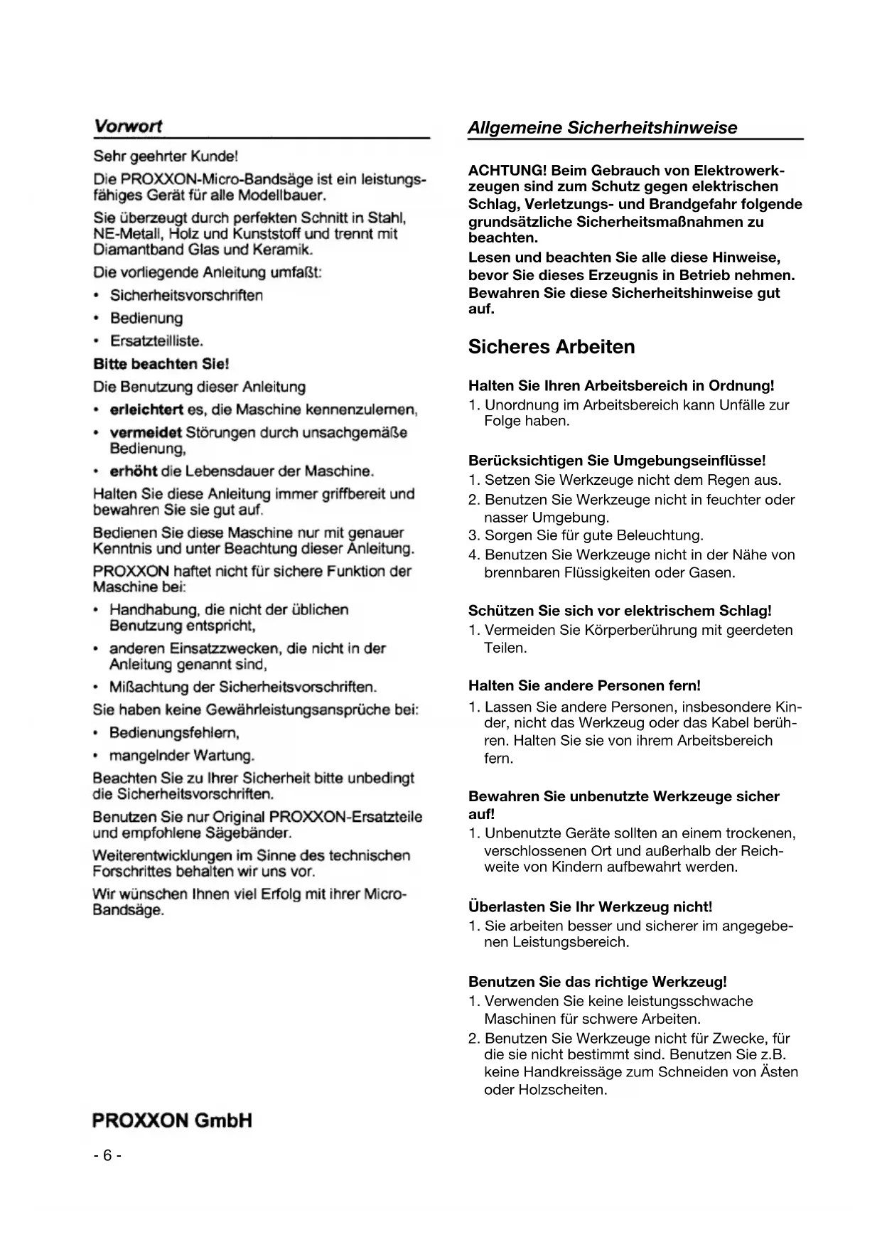 PROXXON haftet nicht für sichere Funktion der Maschine bei: