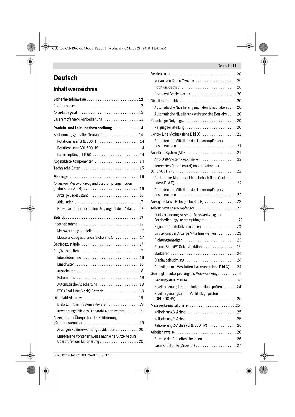 - F G OBJ_BUCH-1960-005.book Page 10 Monday, March 26, 2018 10:03 AMDeutsch | 11 Bosch Power Tools 1 609 92A 4DX | (28.3.18) Deutsch Inhaltsverzeichnis Sicherheitshinweise p. 12