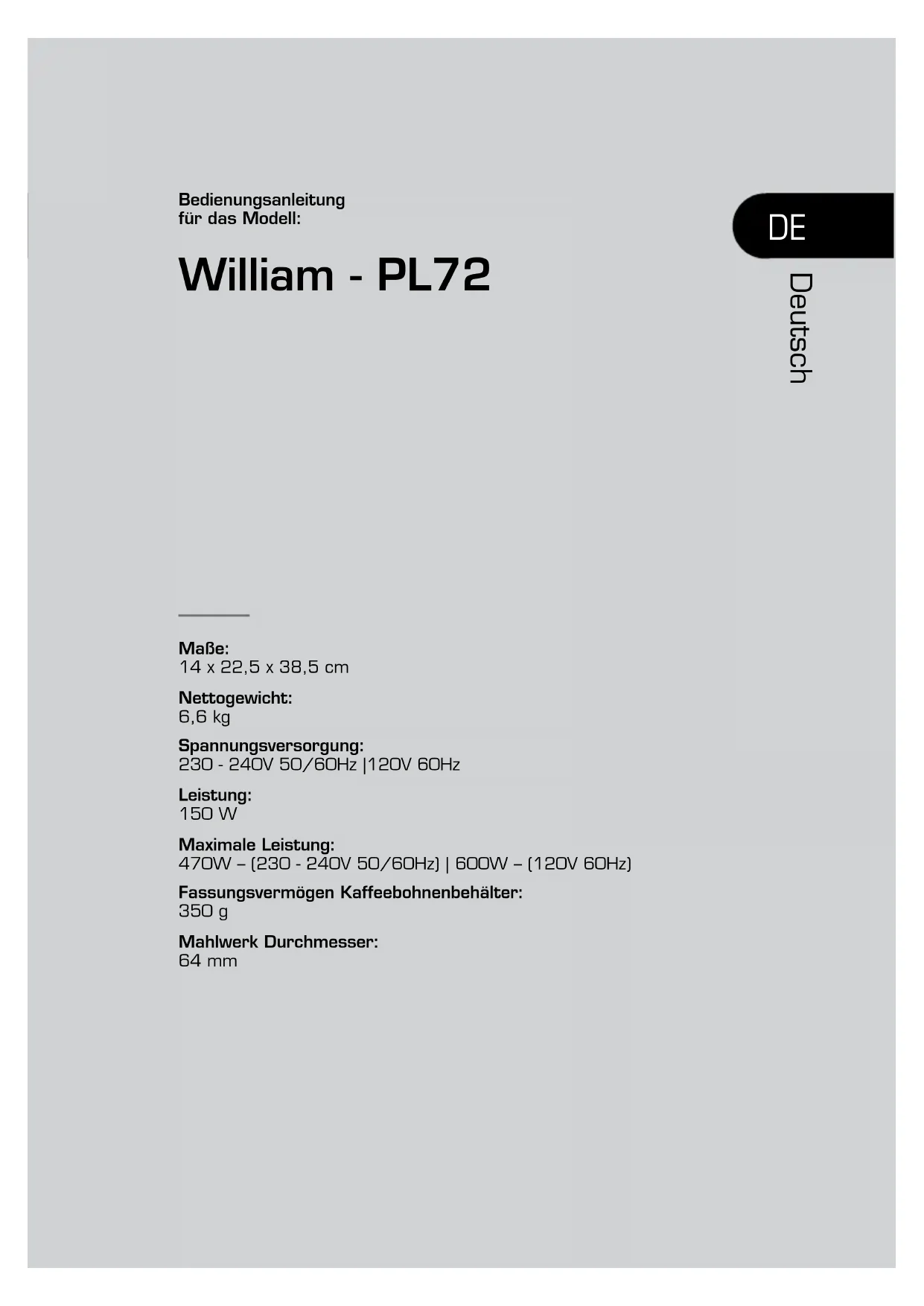 Allgemeine Hinweise Dieses Handbuch ist ein wesentli- cher Bestandteil des Produkts. Lesen Sie sorgfältig die darin enthaltenen Hinweise, denn sie liefern Ihnen wichtige Anweisungen bezüglich der sicheren Installation, Verwendung und Wartung. Bewahren Sie diese Anleitung zum späteren Nachschla- gen auf. - Bitte lesen Sie alle Anweisungen. - Bewahren Sie das Verpackungs- material (Plastikbeutel, Polyuret- han-Hartschaum usw.) außerhalb der Reichweite von Kindern auf. - Diese Hinweise warnen vor nicht be- stimmungsgemäßer Verwendung. - Das Gerät ist ausschließlich zum Mahlen von gerösteten Kaffeeboh- nen vorgesehen. - Das Gerät ist ausschließlich für den Haushalts-, und ähnlichen Anwen- dungsbereichen zu verwenden: z.B. in Personalküchen, Büros und ver- wandten Arbeitsumgebungen; von Kunden in Hotels, Motels und andere Wohnumfelder; Bed & Breakfast und ähnliche Strukturen. Es ist nicht für ein kontinuierliches, kommerzielles oder professionelles Mahlen geeignet. - Eine genaue Überwachung ist er- forderlich, wenn das Gerät von oder in der Nähe von Kindern verwendet wird. Kinder sollten beaufsichtigt werden, um sicherzustellen, dass sie nicht mit dem Gerät spielen. - Setzen Sie das Gerät keiner Feuch- tigkeit oder Wasserstrahlen aus. - Das Gerät kann von Personen mit eingeschränkten körperlichen, sen- sorischen oder geistigen Fähigkei- ten oder mangelnder Erfahrung und Kenntnis verwendet werden, wenn sie beaufsichtigt oder in die sichere Verwendung des Geräts eingewie- sen wurden und die damit verbun- denen Gefahren verstehen. - Das Gerät darf nur in Umgebungen installiert und verwendet werden, wo Personen mit Erfahrung und Kenntnis, besonders bezüglich Si- cherheit und Hygiene geschult und instruiert wurden! - Der Produzent übernimmt keiner- WICHTIGE SCHUTZMAßNAHMENWilliam - PL72
