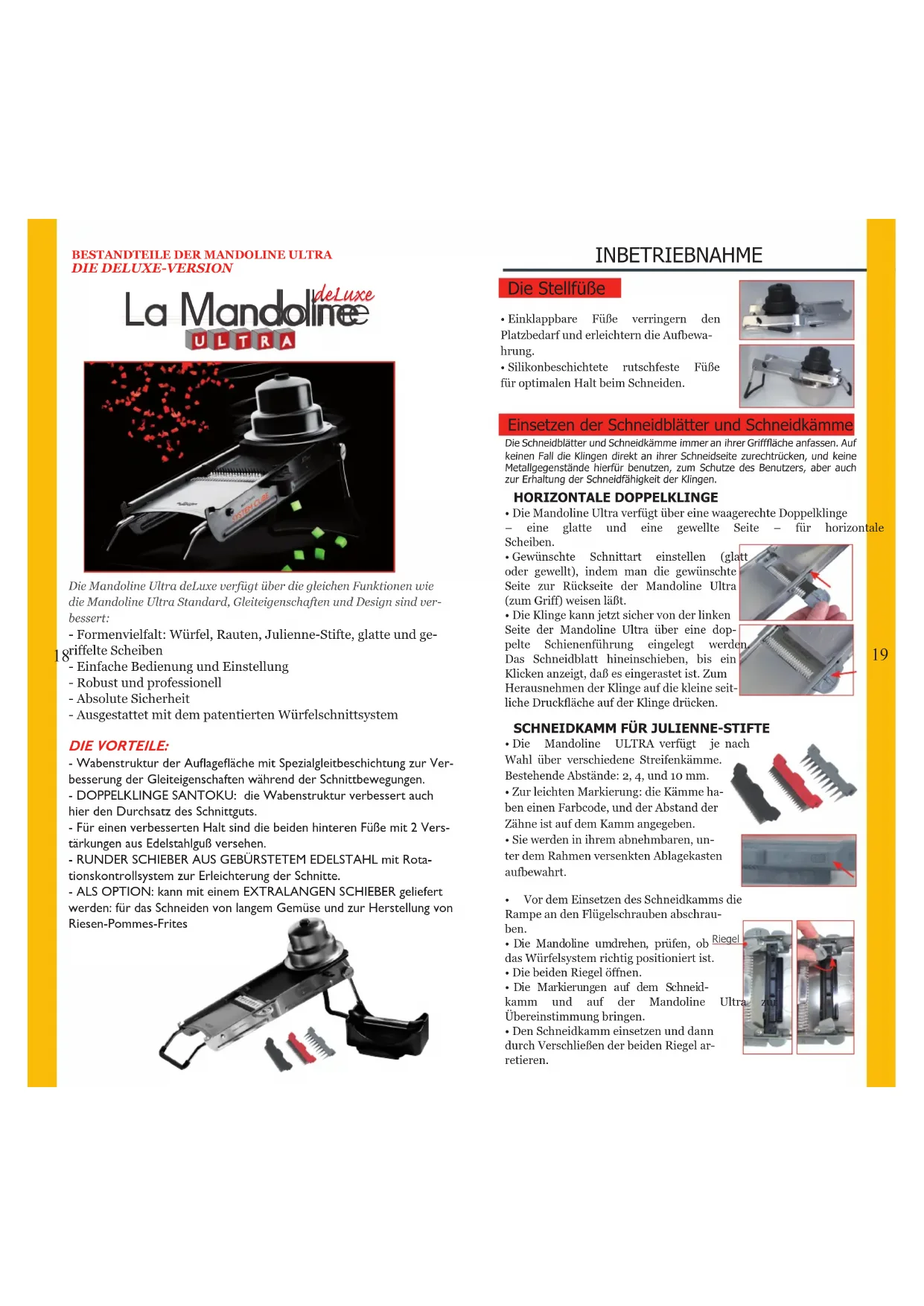 Die Mandoline Ultra de Buyer ist ein Obst- und Gemüseschneidegerät, das damit konzipiert wurde. Ihnen bei größter Sicherheit die Zubereitung ihrer Rezepte zu erhögbeken. Allerdings setzt das Gerät den Einsatz von ganz besondere scharfen Schneidblättern und Schneidkommen voraus, die unbedingt mit großter Vorsicht zu behandeln sind. Aus thisem Grund bitten wir Sie um die Beachtung der folgenden Benutzungsregeln:
